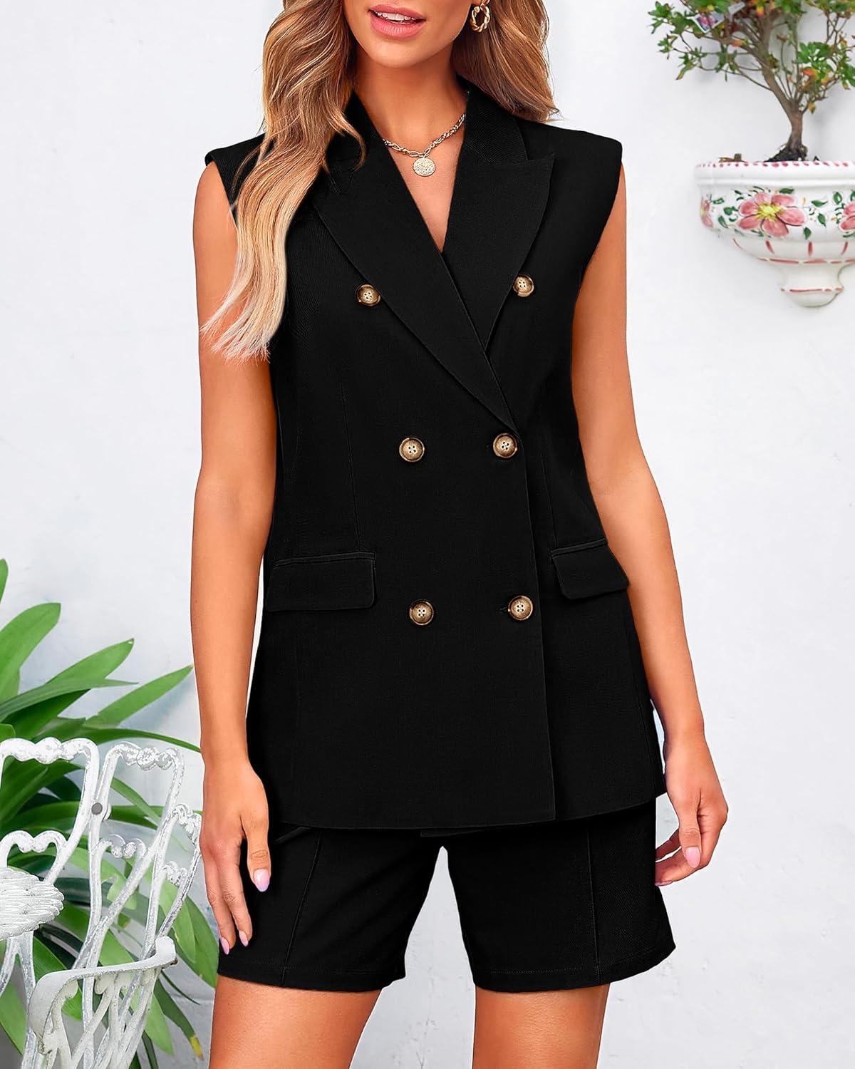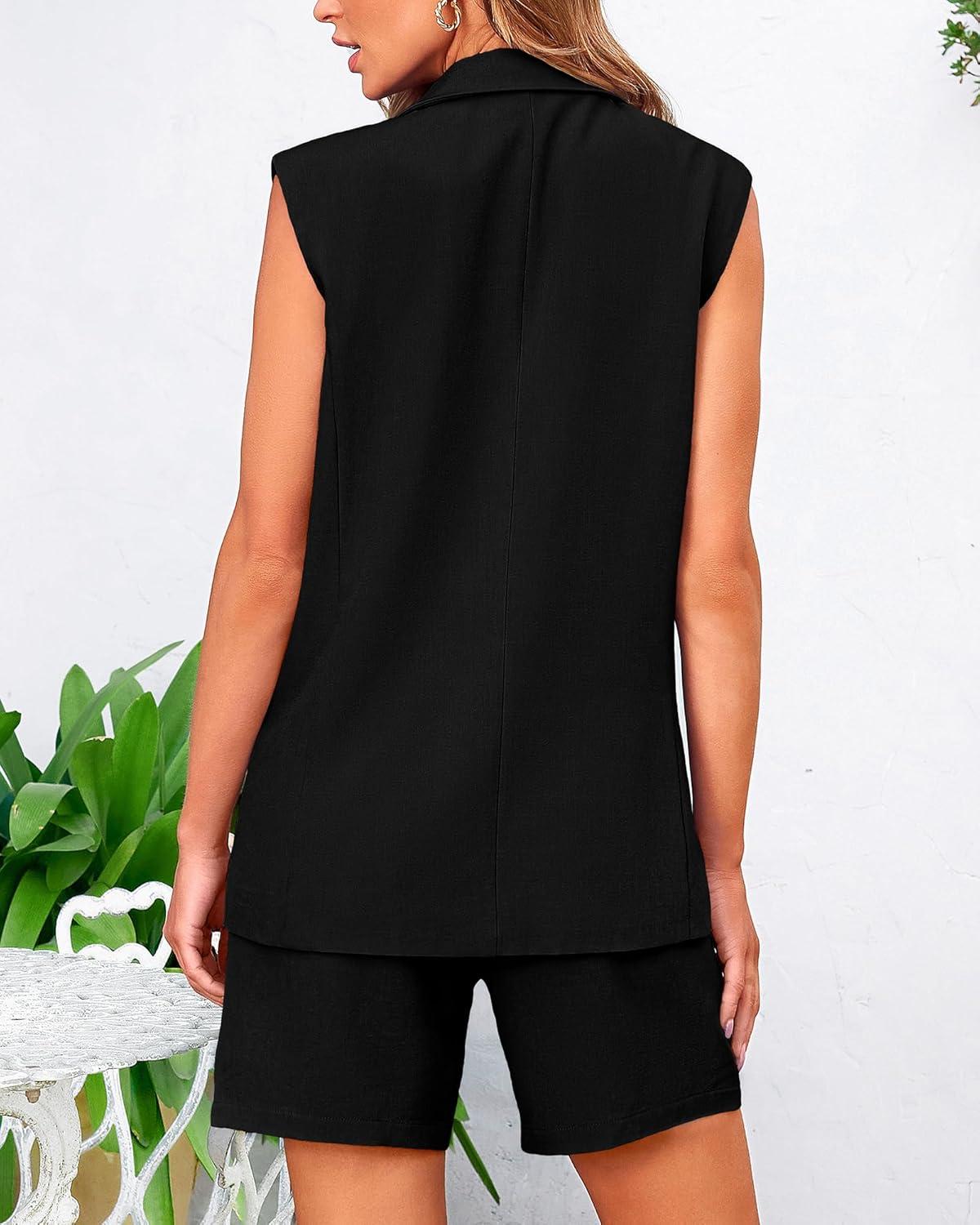 BTFBM 2 Piece Outfits For Women Summer 2025 Sleeveless Button Down Business Casual Vest Shorts Sets Work Clothes Pockets(Black)