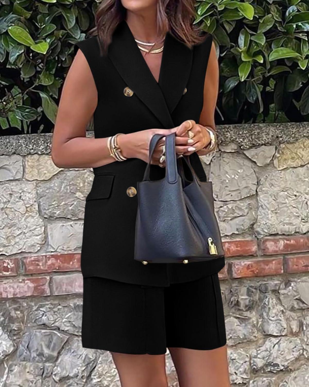 BTFBM 2 Piece Outfits For Women Summer 2025 Sleeveless Button Down Business Casual Vest Shorts Sets Work Clothes Pockets(Bao_bl)