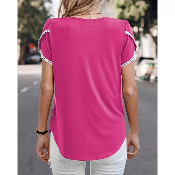 BTFBM 2023 Women Casual T-Shirts Crewneck Lace Crochet Short Sleeve Blouse Curved Hem Solid Color Loose Tunic Summer Tops(Solid Rose Red)