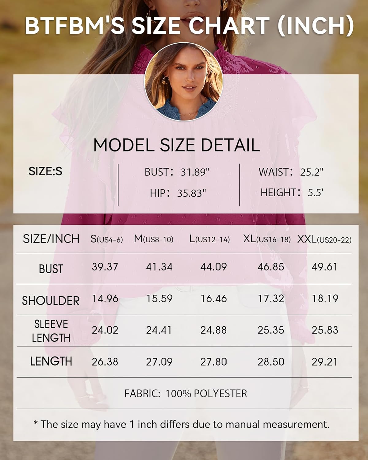 FEATURES: S=US 4-6, M=US 8-10, L=US 12-14, XL=US 16-18, XXL=US 20 / Casual Fall Tops / Long Sleeve Blouse Tops / Feminine V Neck / Lace Crochet / Flutter Ruffle Trim / Swiss Dot / Loose / Boho Shirt For Women / Flowy Babydoll Tunic Top