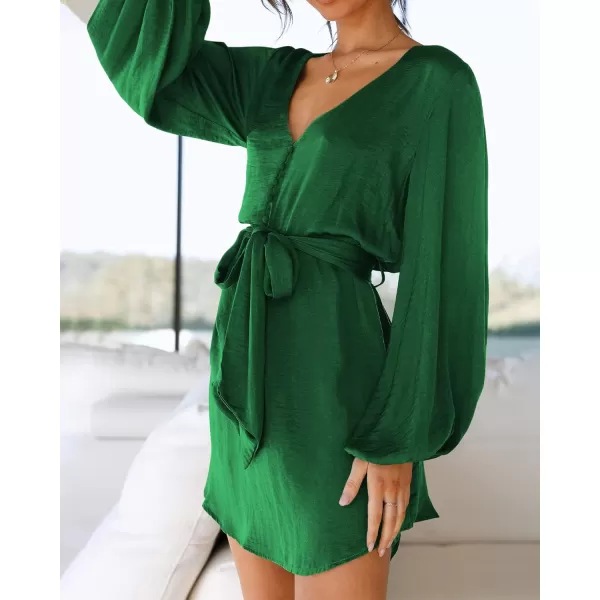 BTFBM 2023 Women’s Long Puff Sleeve Satin Dress Casual V Neck Belted Short Spring Summer Party Cocktail Mini Dresses(Solid Green)