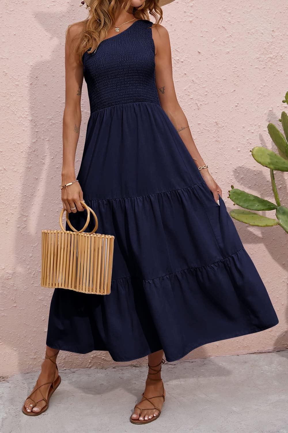 Don’t miss out on our limited-time offer: buy BTFBM 2025 Summer One Shoulder Dresses for Women Casual Sleeveless High Waist Floral Flowy Smocked Boho Beach Maxi Dress(Solid Navy), get {accessory} free!
