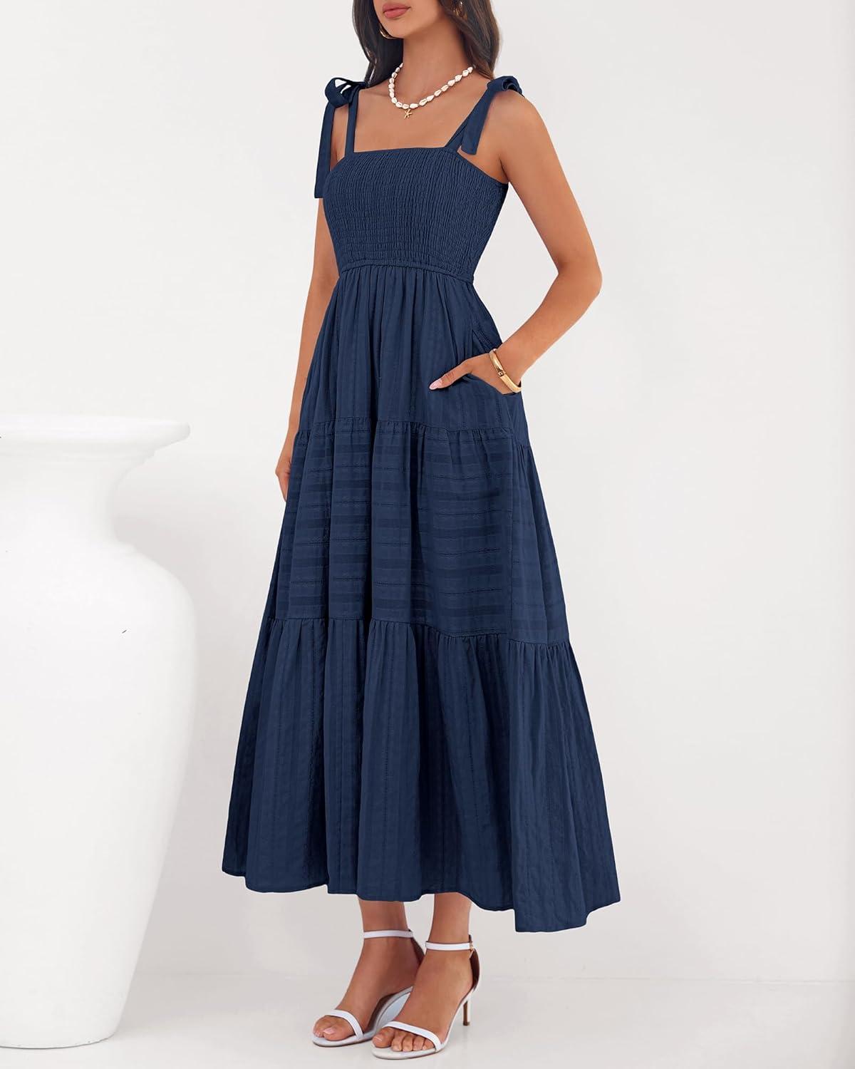 BTFBM Boho Maxi Dress Sleeveless Summer Dresses for Women 2026 Beach Vacation Smocked A Line Casual Sundress Pockets(Navy Blue)