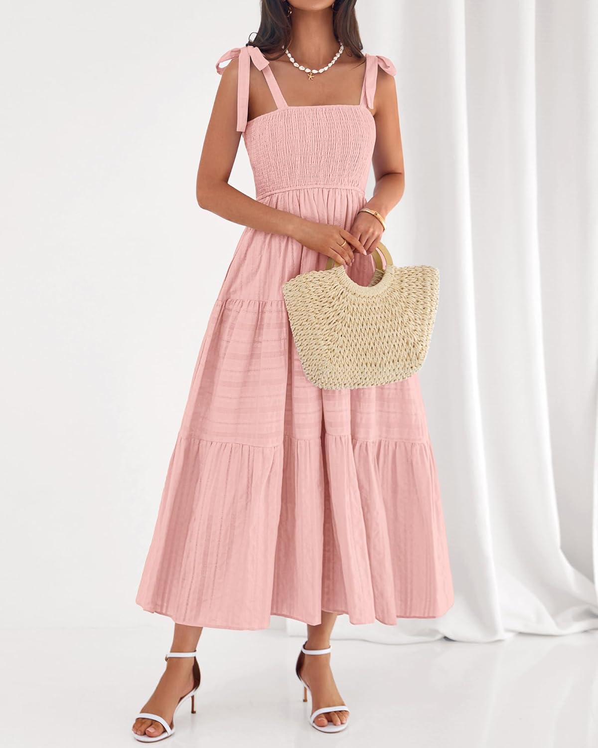 BTFBM Boho Maxi Dress Sleeveless Summer Dresses for Women 2026 Beach Vacation Smocked A Line Casual Sundress Pockets(Pink)