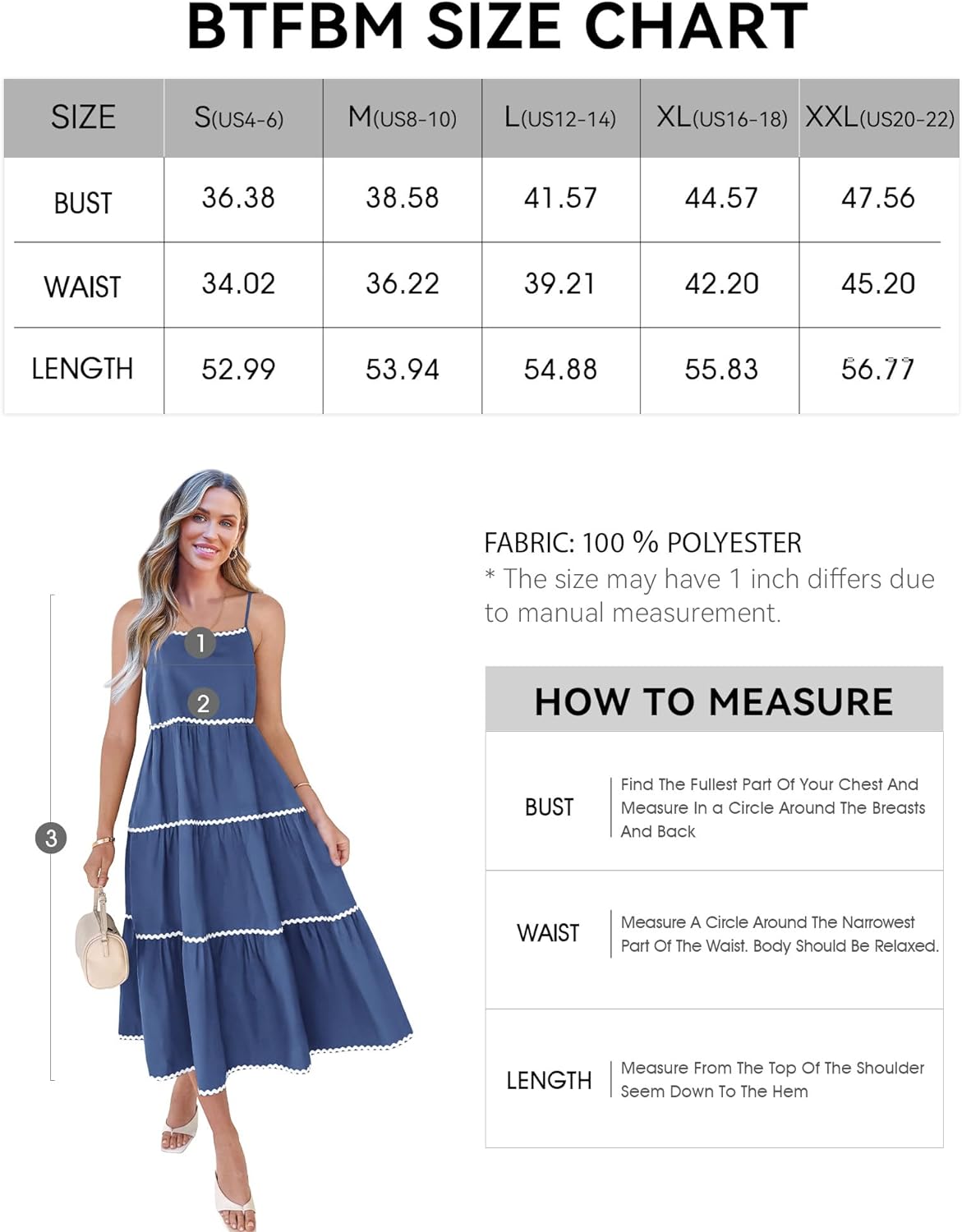 Get your hands on our exclusive BTFBM Boho Summer Dresses 2024 Vacation Spaghetti Strap Backless RIC Rac Trim Tiered A-Line Long Casual Swing Sundress collection, now at a discounted price.