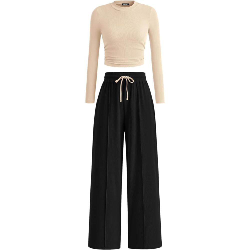 BTFBM Casual 2 Piece Sets For Women Fall Outfits 2025 Ribbed Long Sleeve Crop Top Wide Leg Pants Matching Lounge Set(Beige Black)