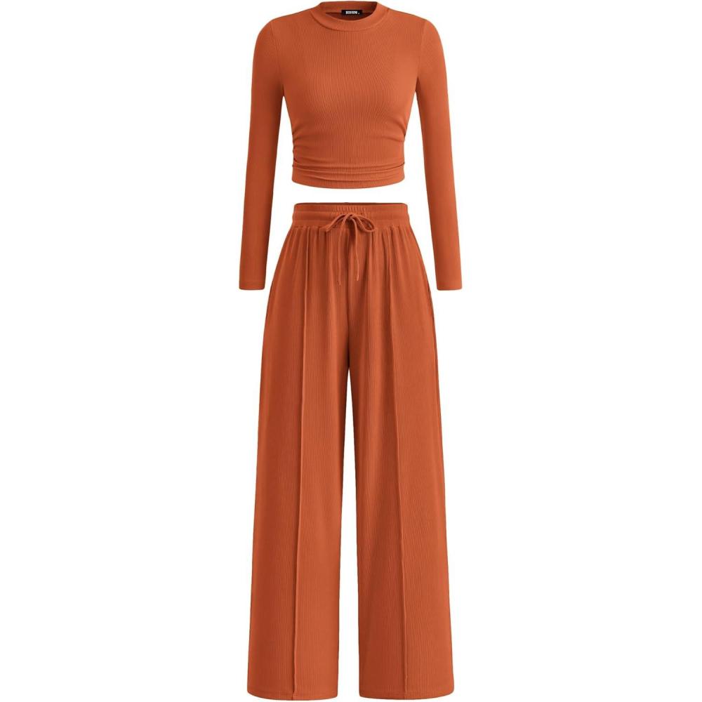 BTFBM Casual 2 Piece Sets For Women Fall Outfits 2025 Ribbed Long Sleeve Crop Top Wide Leg Pants Matching Lounge Set(Brick Red)