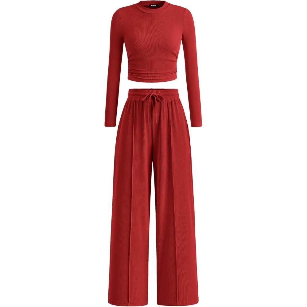 BTFBM Casual 2 Piece Sets For Women Fall Outfits 2025 Ribbed Long Sleeve Crop Top Wide Leg Pants Matching Lounge Set(Fiery Red)