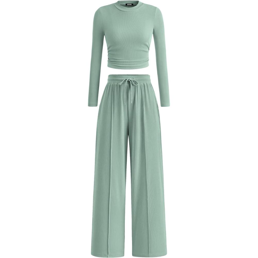 Don’t miss out on our limited-time offer: buy BTFBM Casual 2 Piece Sets For Women Fall Outfits 2025 Ribbed Long Sleeve Crop Top Wide Leg Pants Matching Lounge Set(Fruit Green), get a free {accessory}!