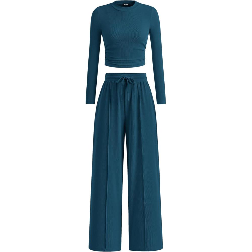 BTFBM Casual 2 Piece Sets For Women Fall Outfits 2025 Ribbed Long Sleeve Crop Top Wide Leg Pants Matching Lounge Set(Lake Blue)