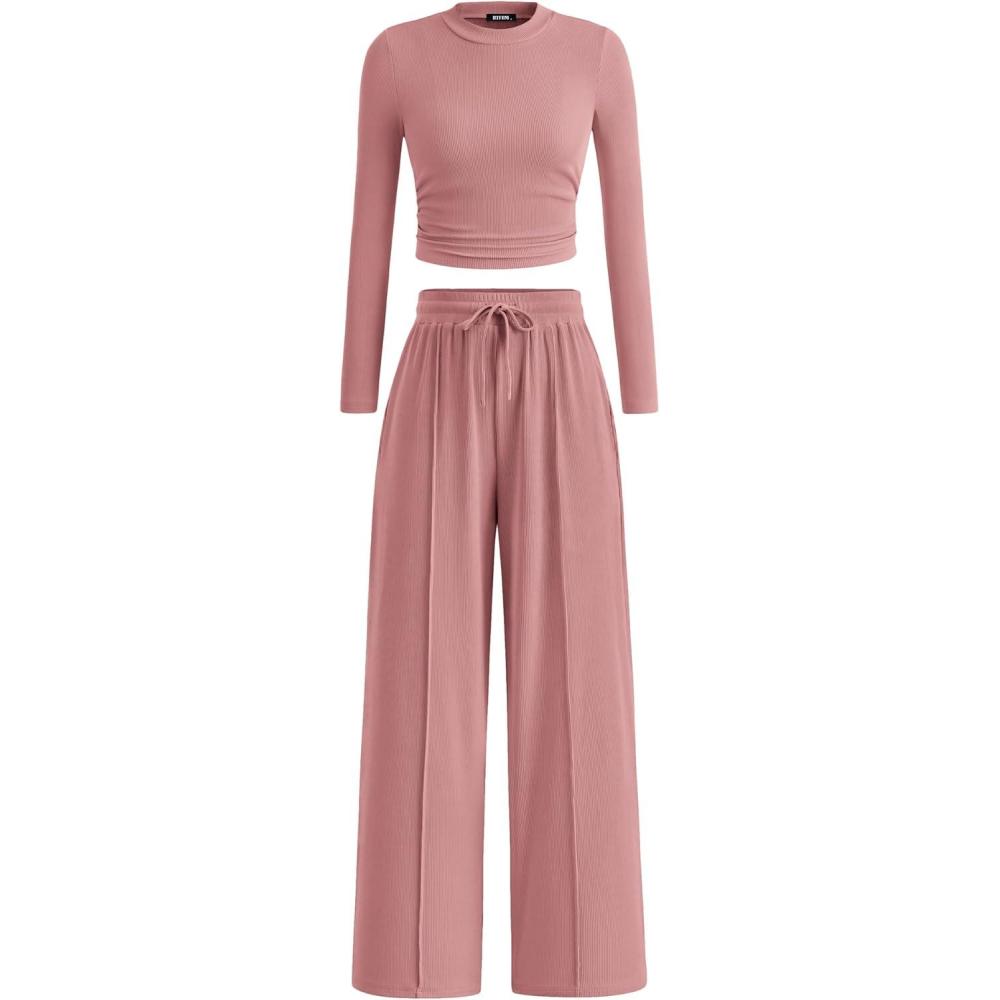 BTFBM Casual 2 Piece Sets For Women Fall Outfits 2025 Ribbed Long Sleeve Crop Top Wide Leg Pants Matching Lounge Set(Pink)