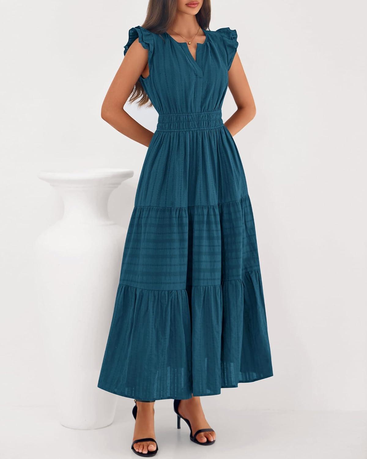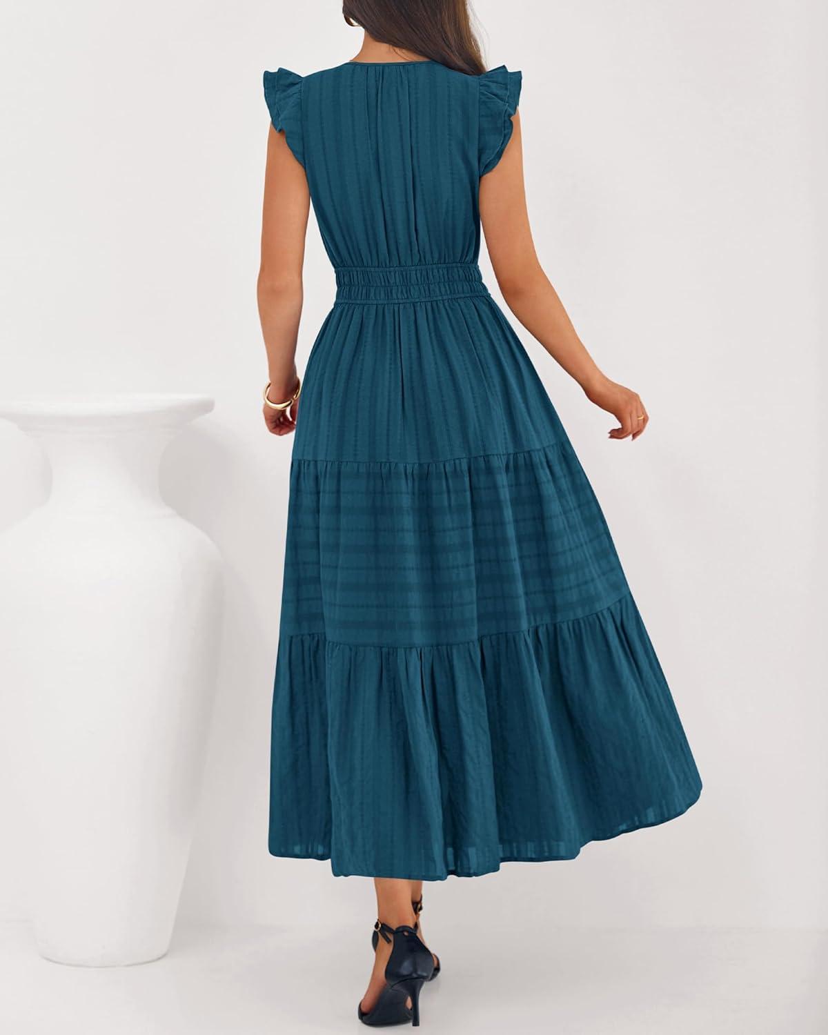 BTFBM Dresses for Women Spring 2026 Maxi Casual Dress Flutter Short Sleeve V Neck Elastic Waist Boho Beach Vacation Pockets(Lake Blue)