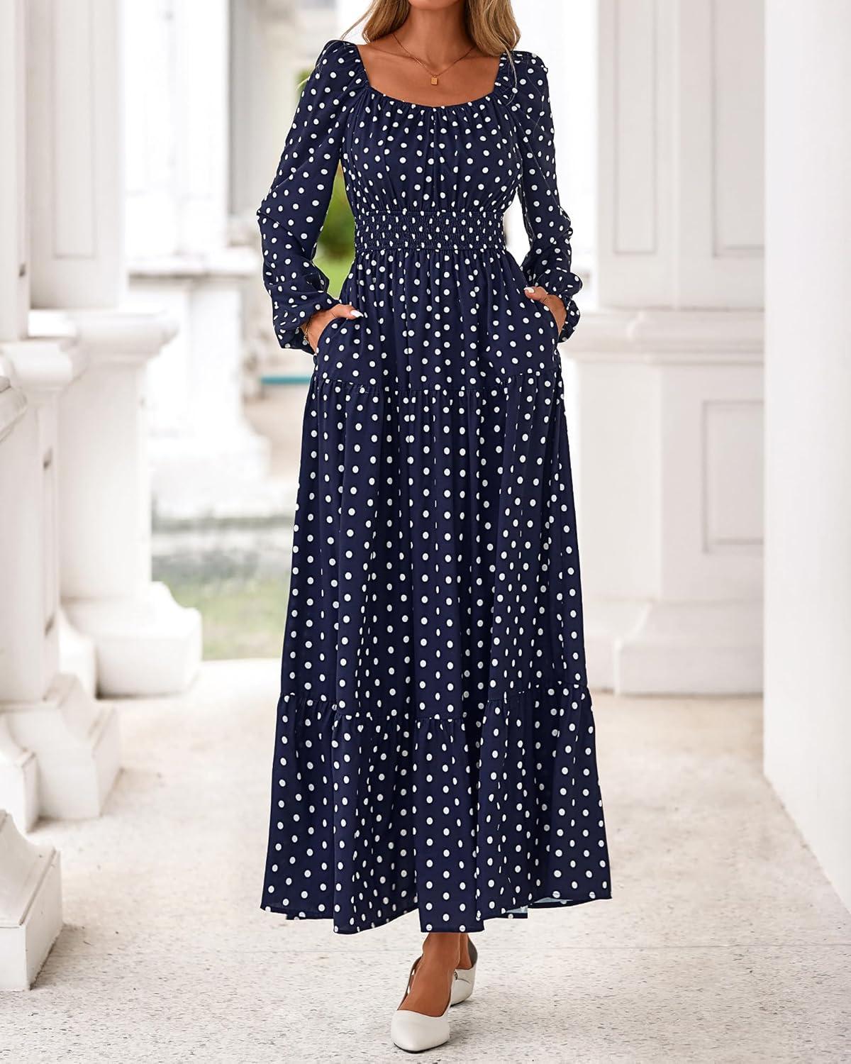 Discover the latest BTFBM Fall Dresses for Women 2025 Long Sleeve Boho Floral Empire Waist Square Neck Casual Flowy Wedding Guest Maxi Dress(Polka Dot Blue White) from and take advantage of our limited-time introductory offer.