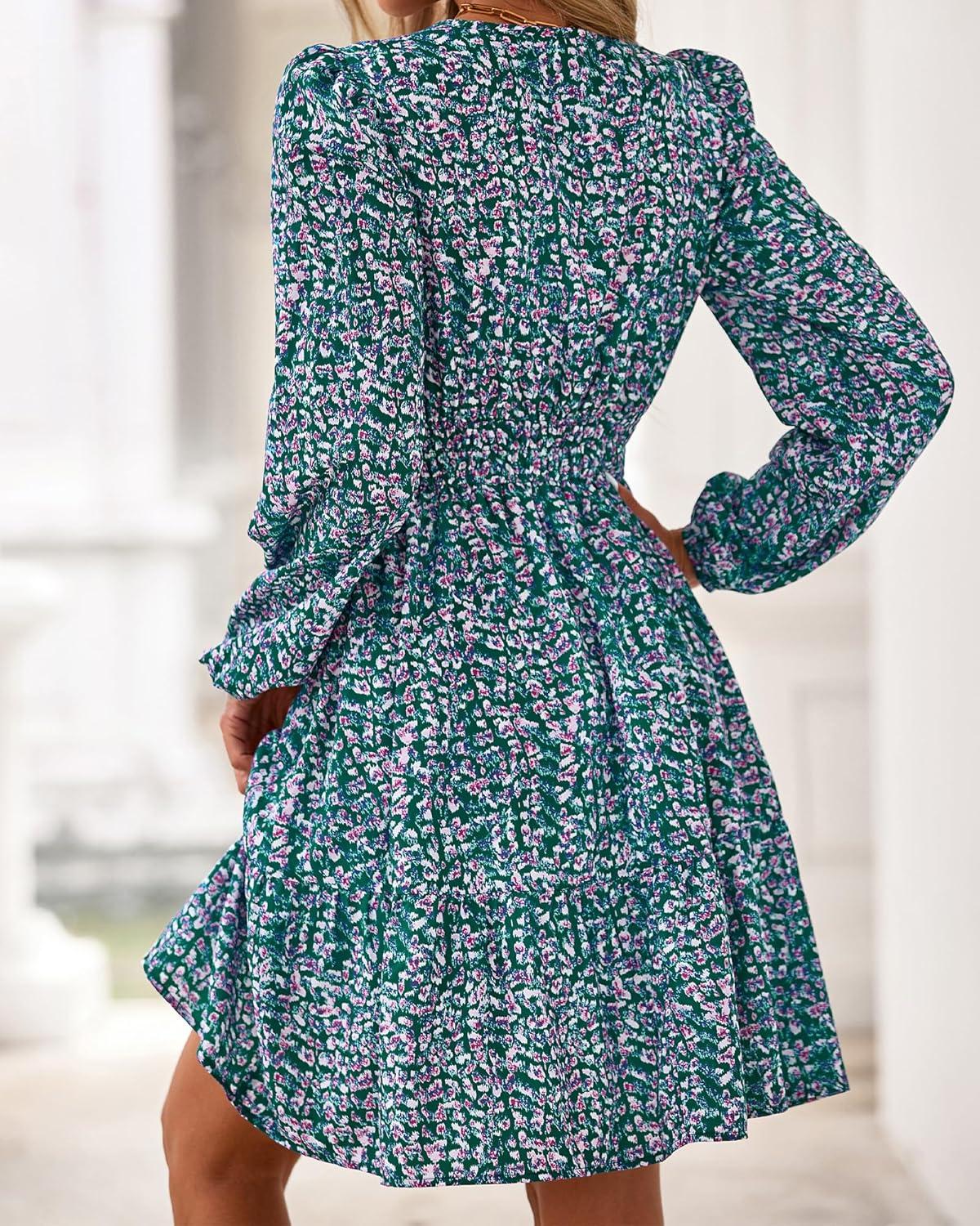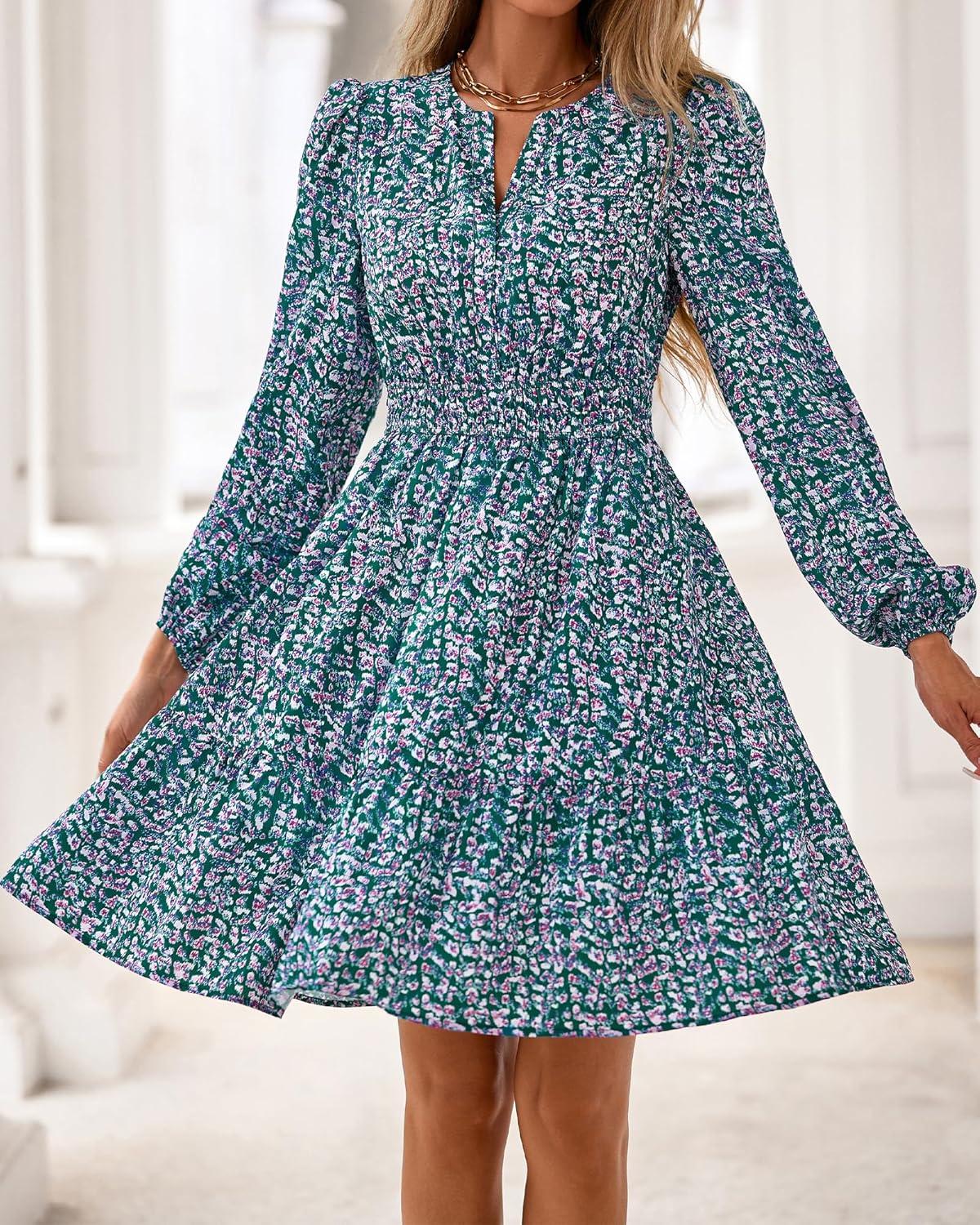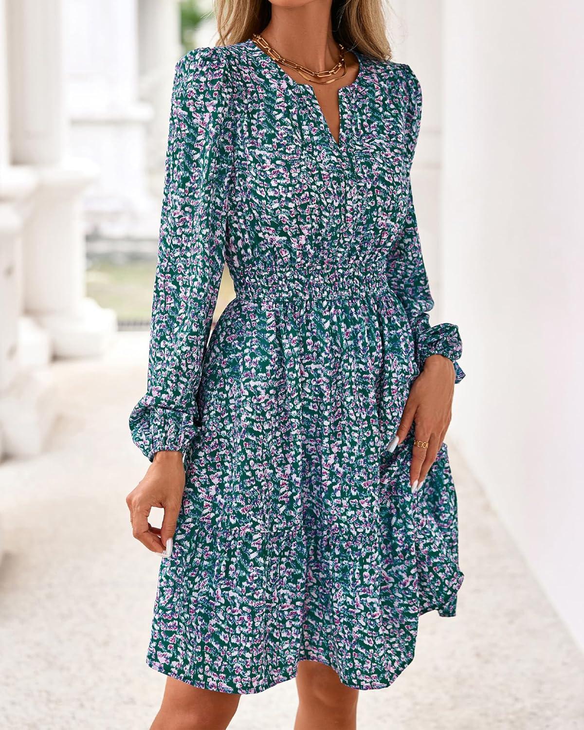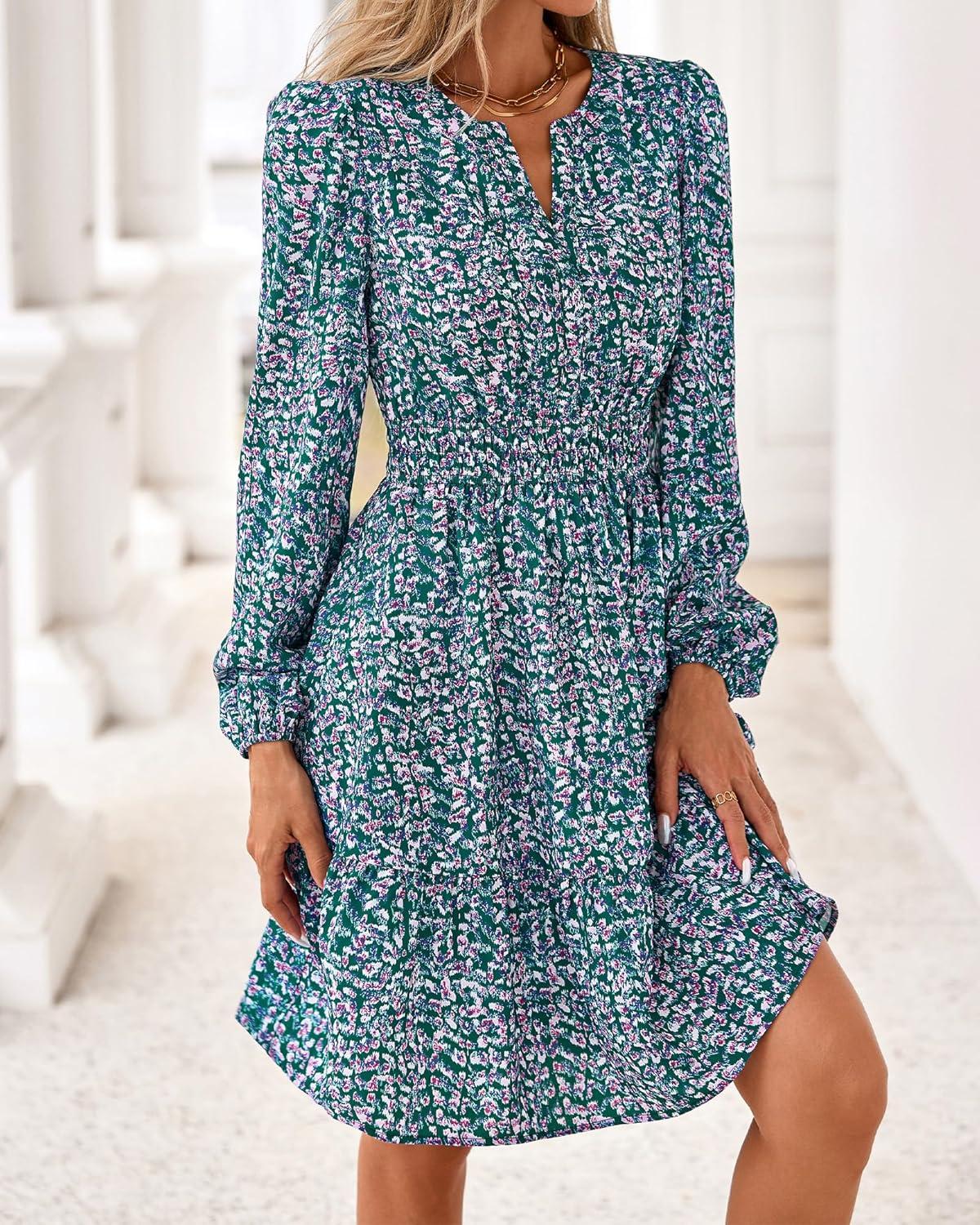 BTFBM Fall Dresses for Women 2025 Long Sleeve Elastic Waist Mini Wedding Guest Dress Boho Floral Beach Vacation Clothes(Floral Purple Green)