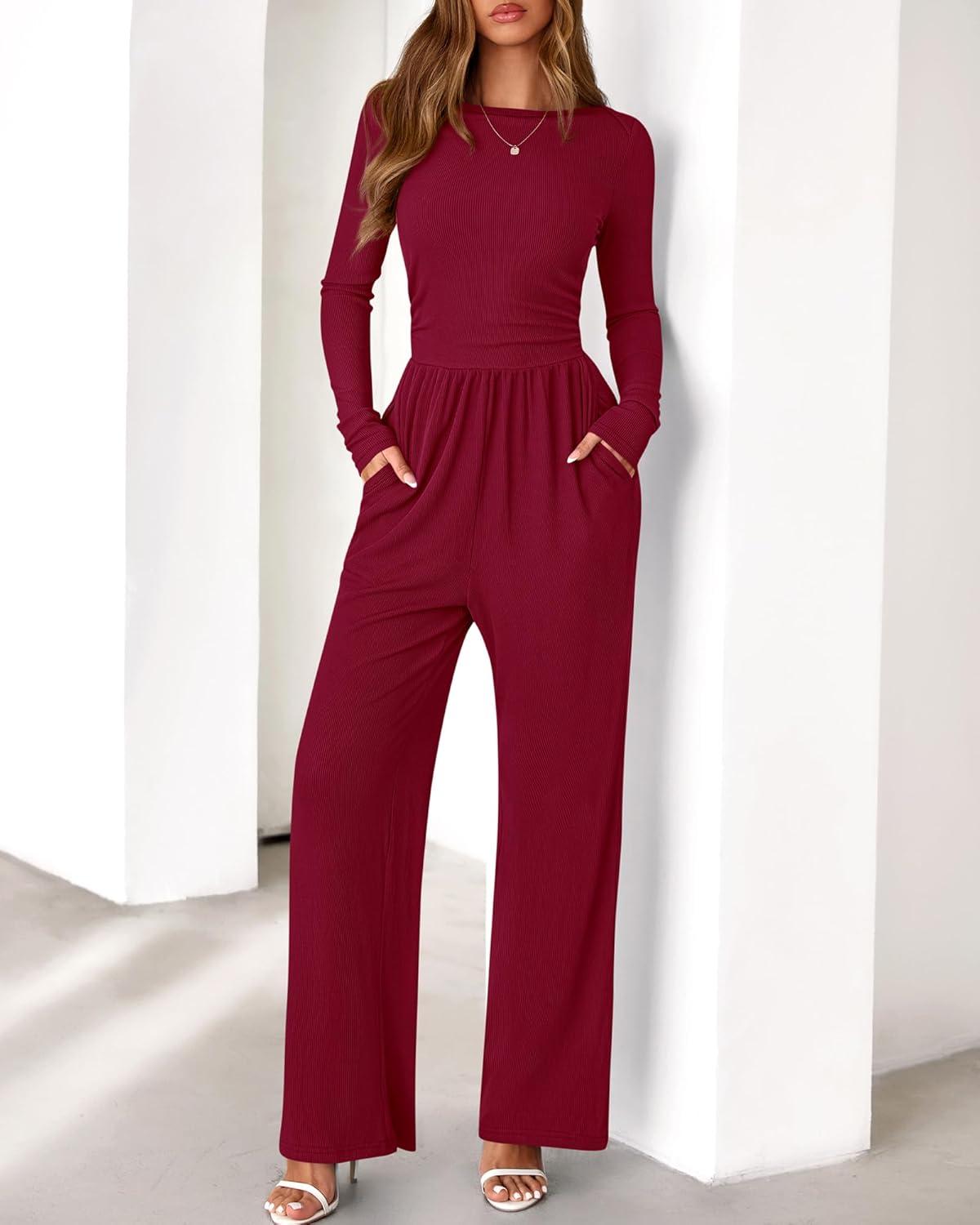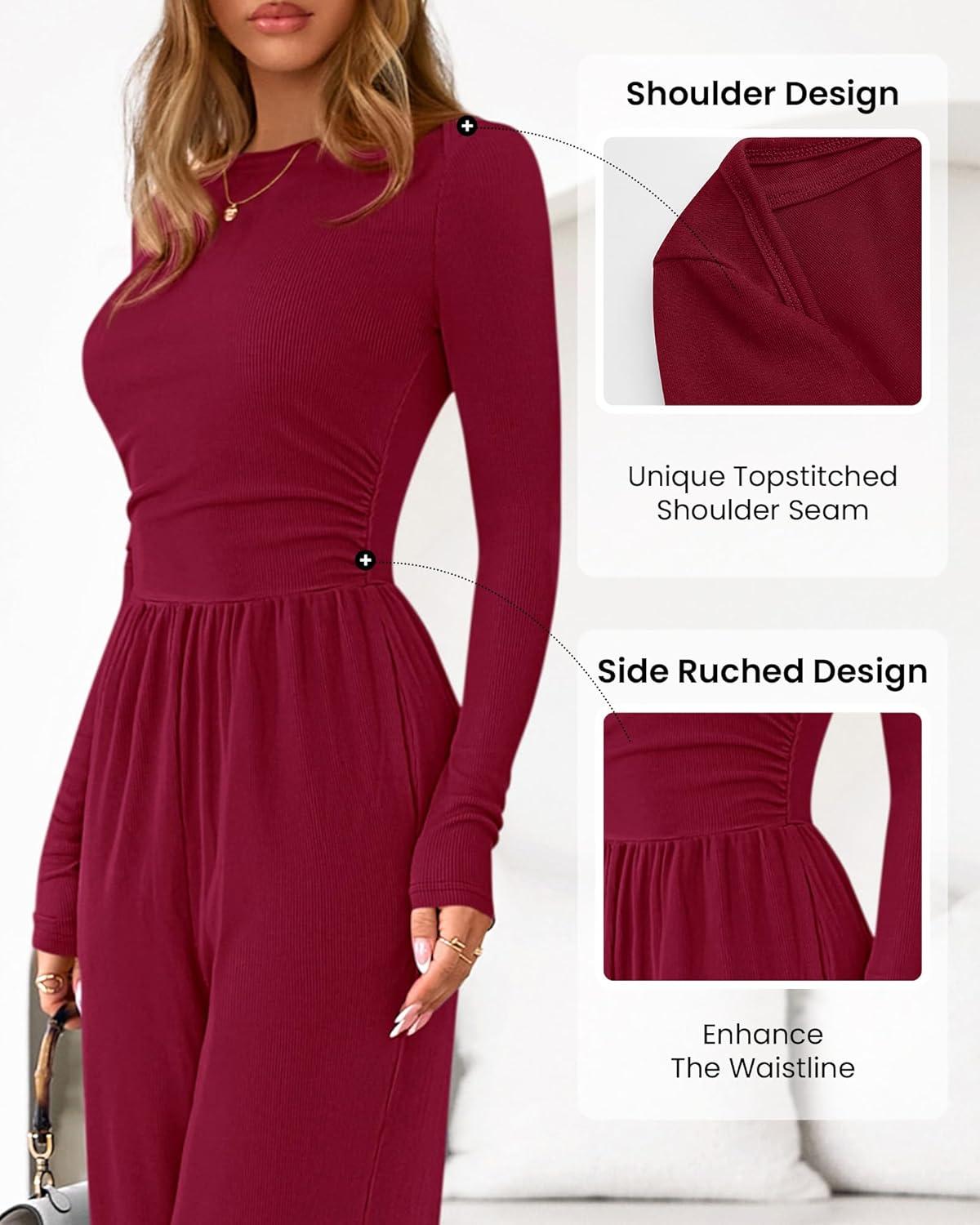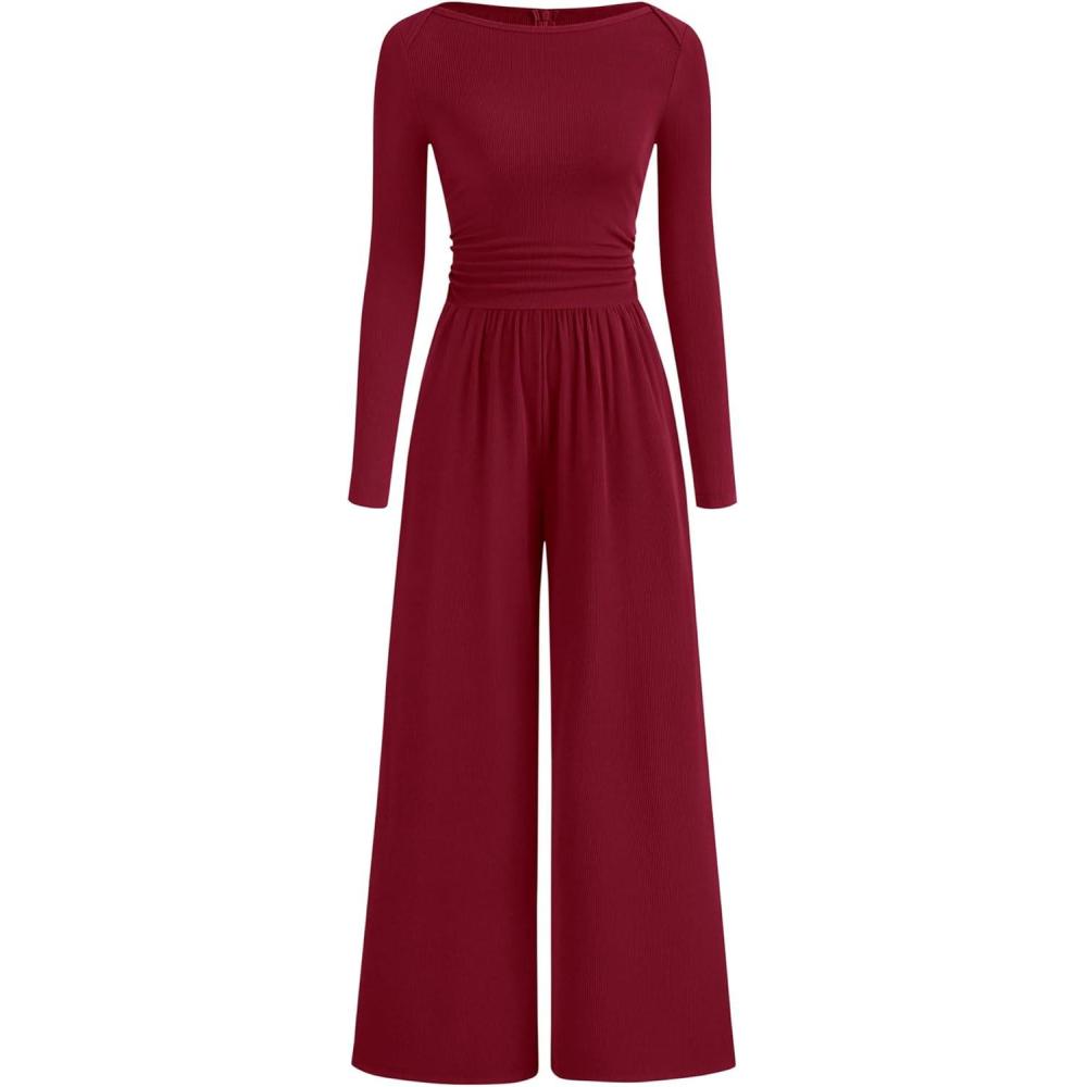 imageBTFBM Jumpsuits For Women One Piece Outfits Long Sleeve Stretchy Knit Wide Leg Pants Womens Jumpsuit Fall Clothes 2025Dark Red