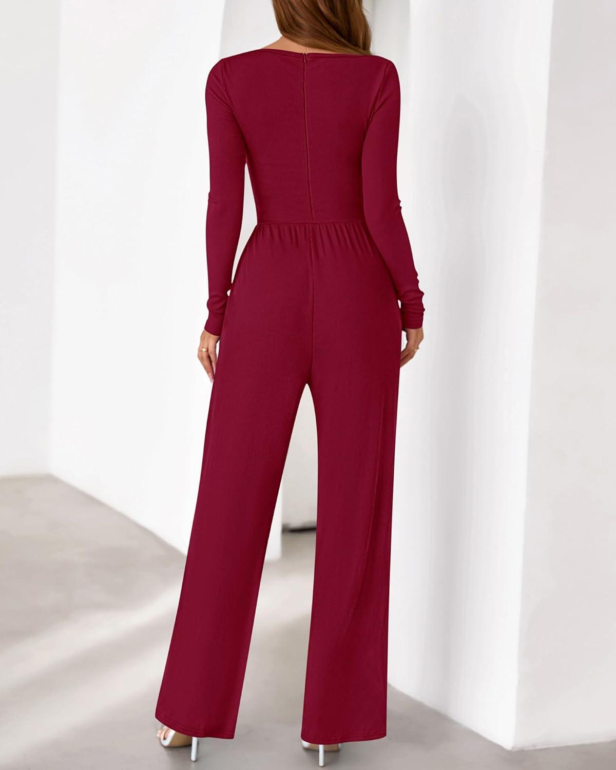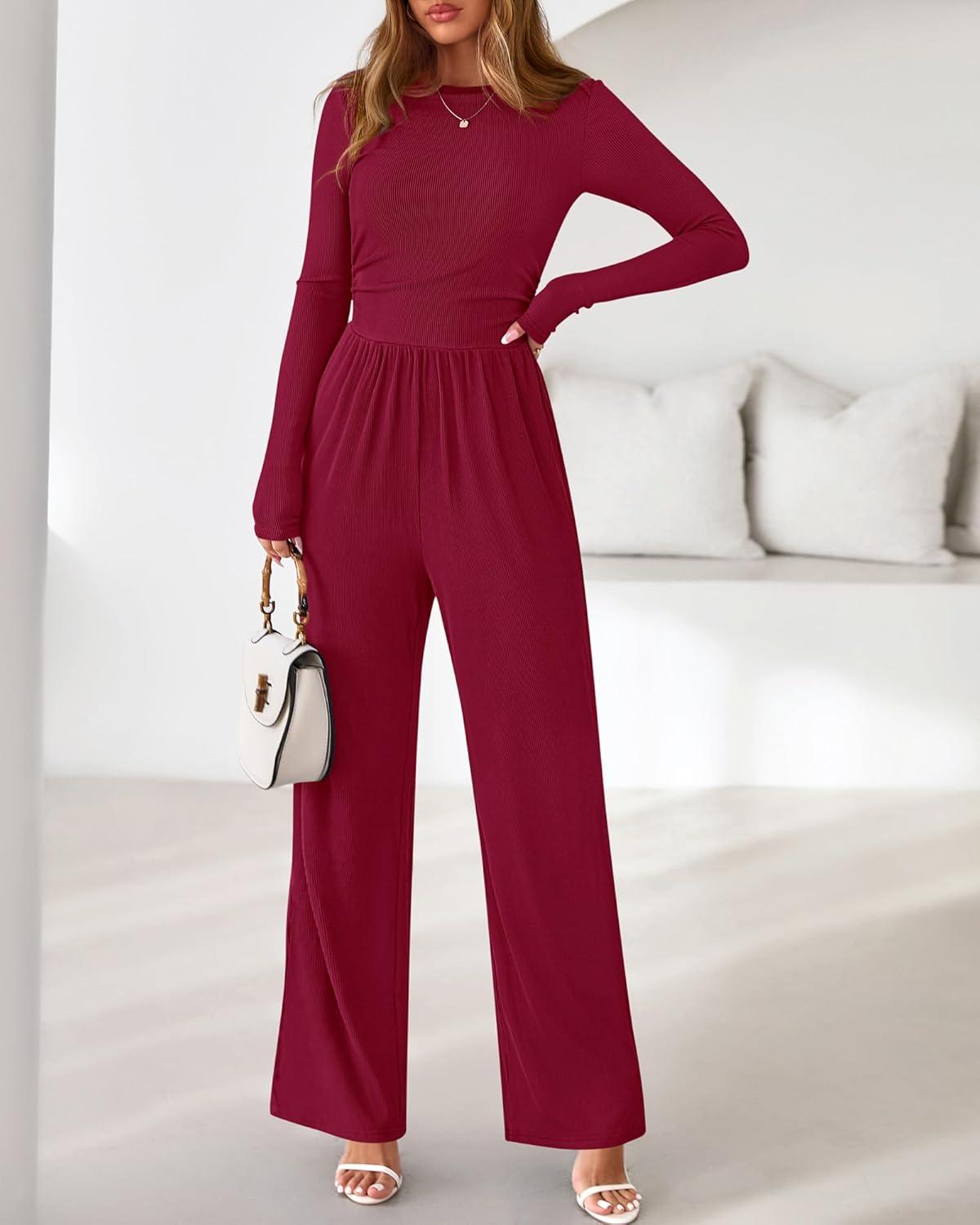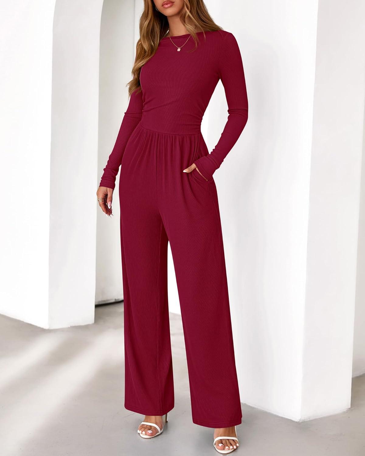 BTFBM Jumpsuits For Women One Piece Outfits Long Sleeve Stretchy Knit Wide Leg Pants Womens Jumpsuit Fall Clothes 2025(Dark Red)