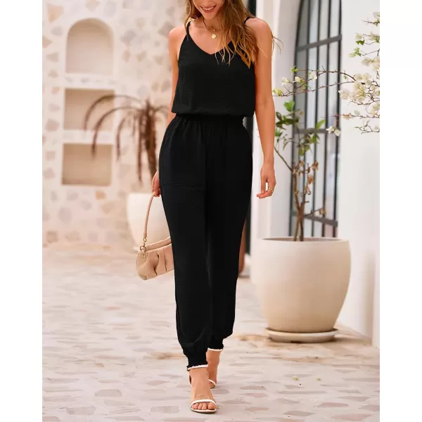 BTFBM Jumpsuits For Women Summer Casual Sleeveless Spaghetti Strap Long Pants Rompers Elastic Waist One Piece Jumpsuit(Solid Black)