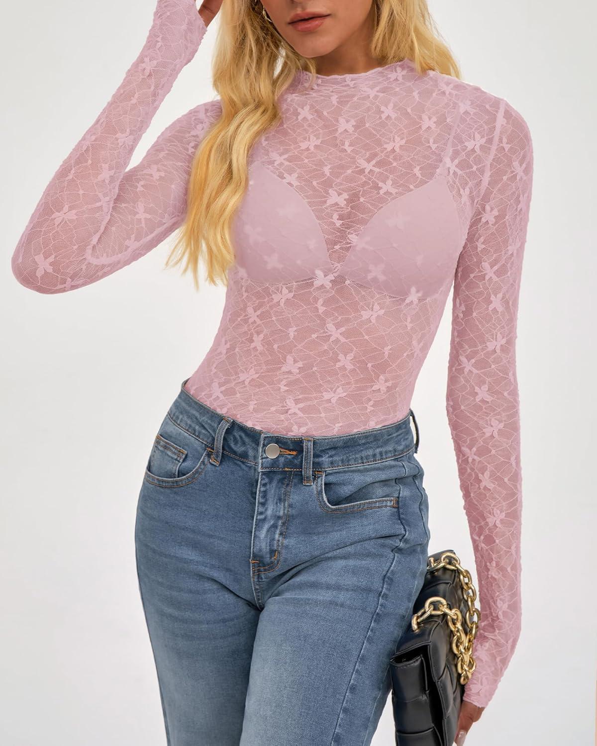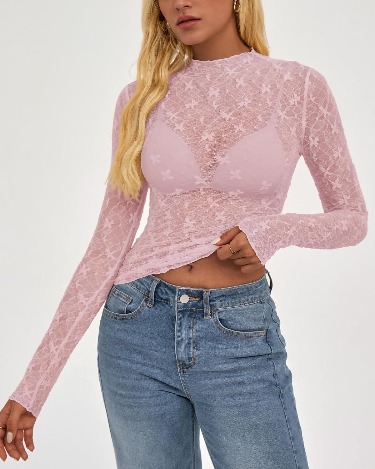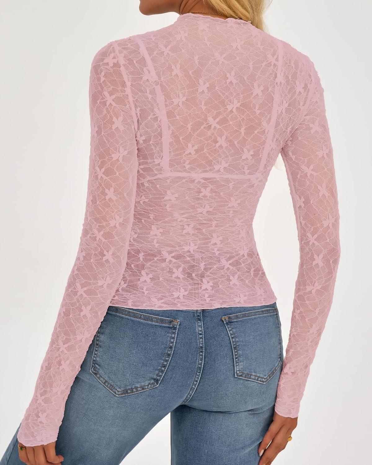 BTFBM Lace Tops for Women 2025 See Through Mesh Top Crew Neck Long Sleeve Fitted Sheer Party Club Outfits Fall Fashion(Pink)