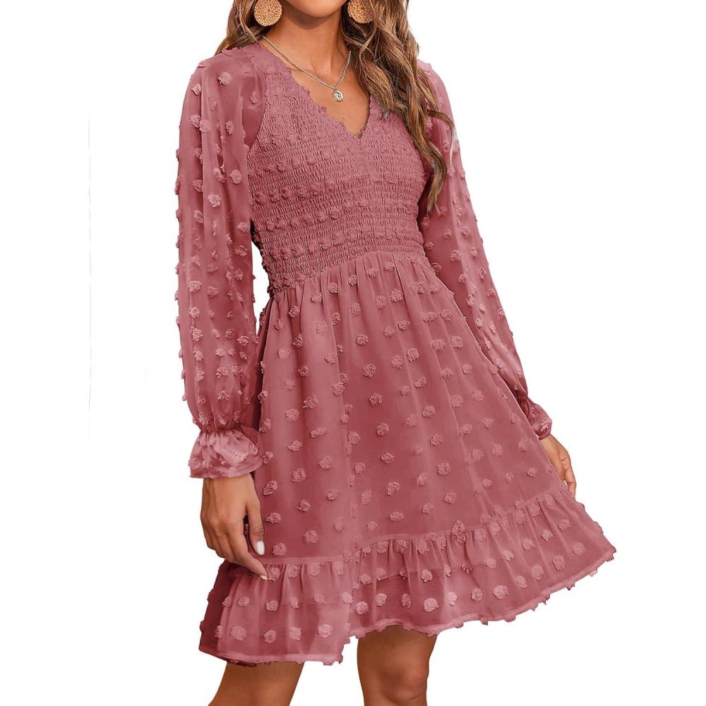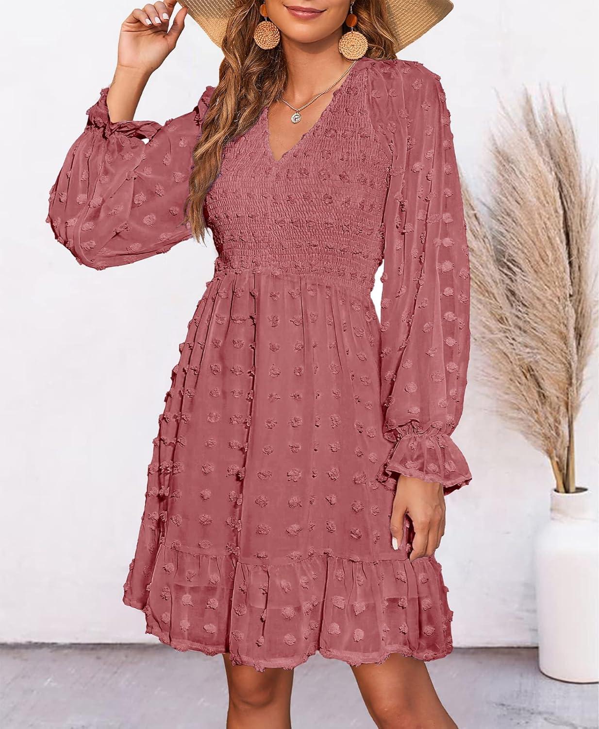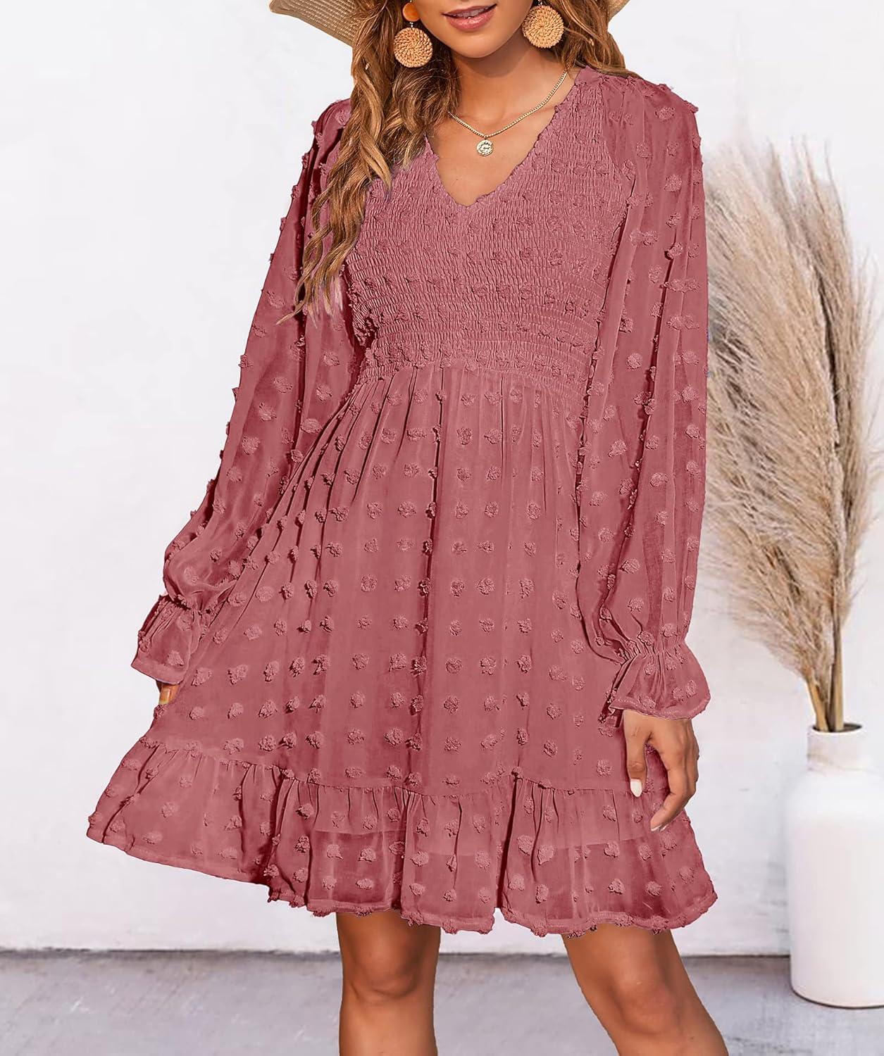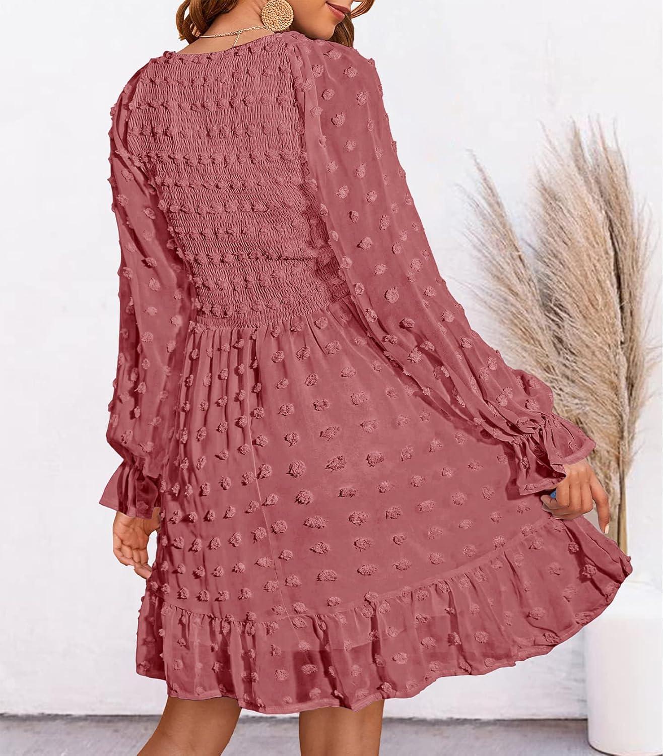 BTFBM Long Sleeve Fall Dresses for Women 2025 Casual V Neck Swiss Dot Smocked Ruffle Chiffon Summer Flowy Mini Dress(Bean Paste Red)