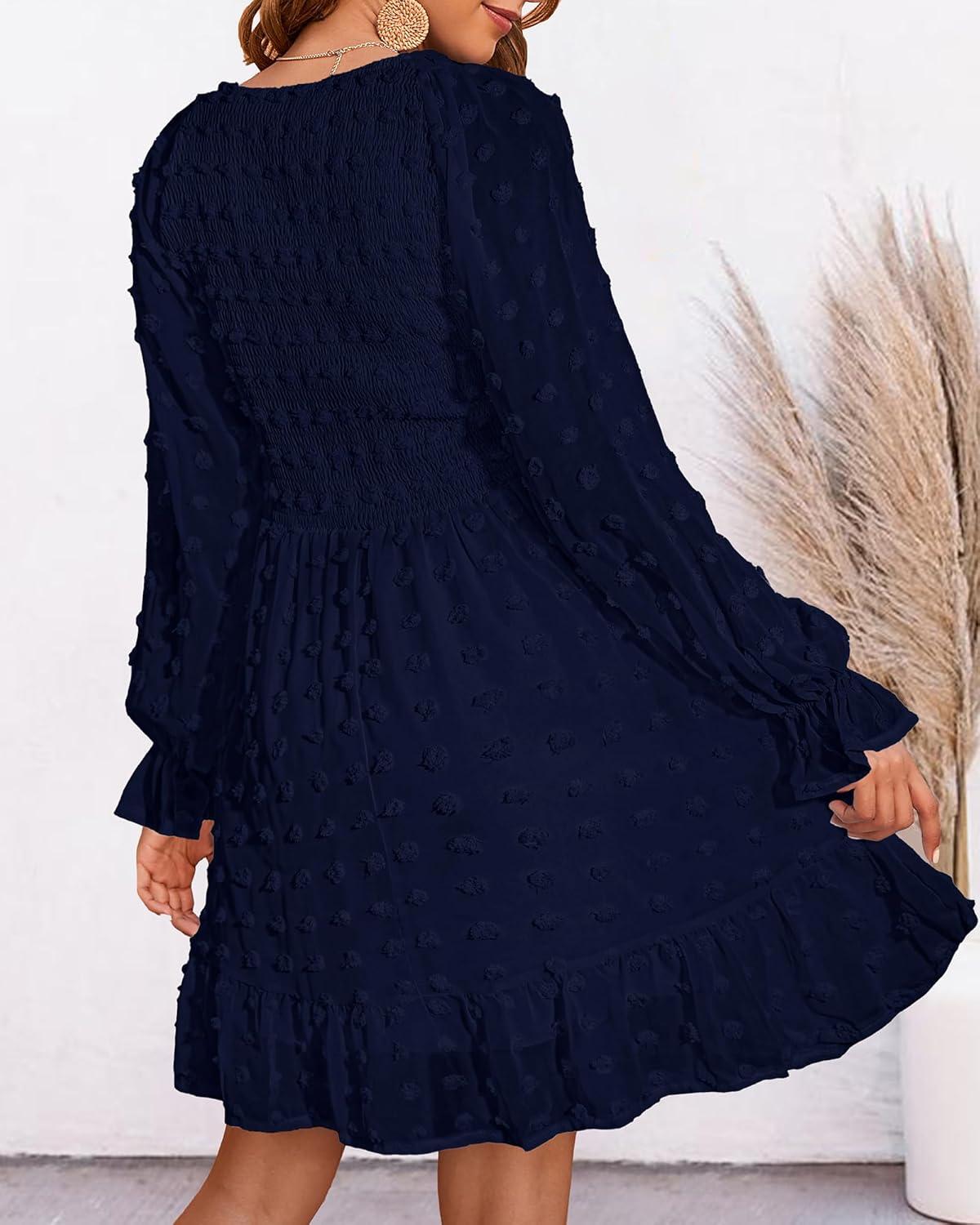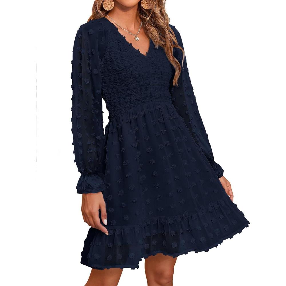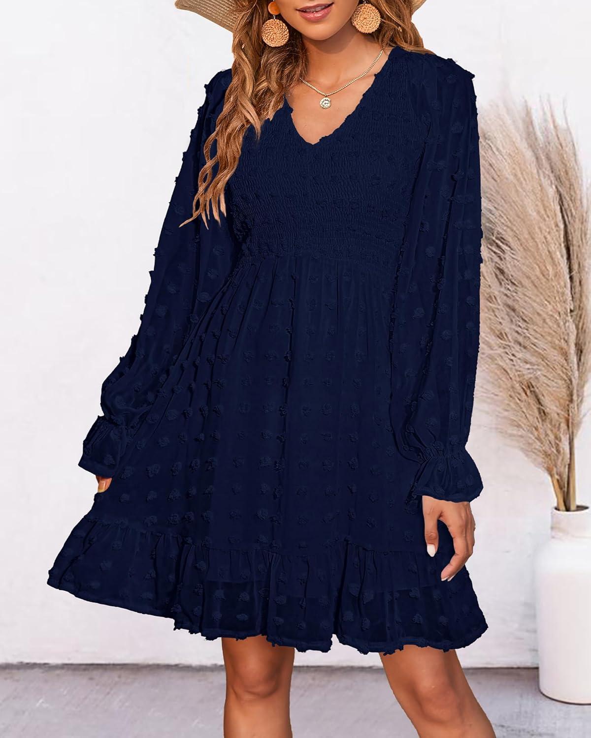 BTFBM Long Sleeve Fall Dresses for Women 2025 Casual V Neck Swiss Dot Smocked Ruffle Chiffon Summer Flowy Mini Dress(Navy)
