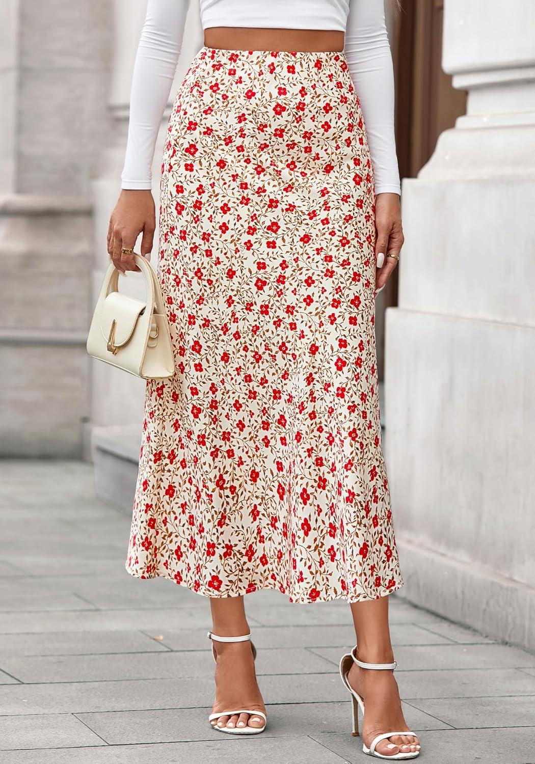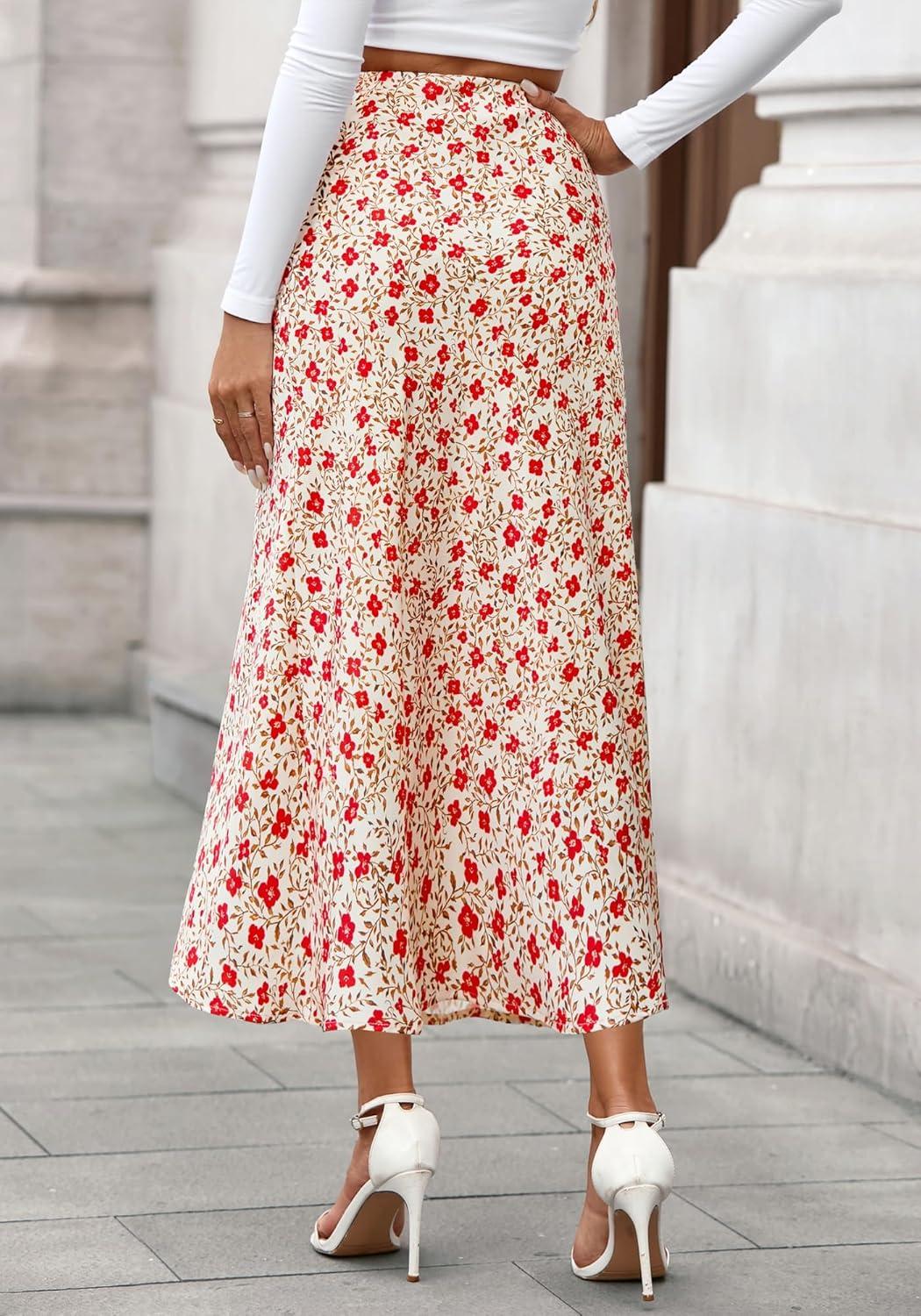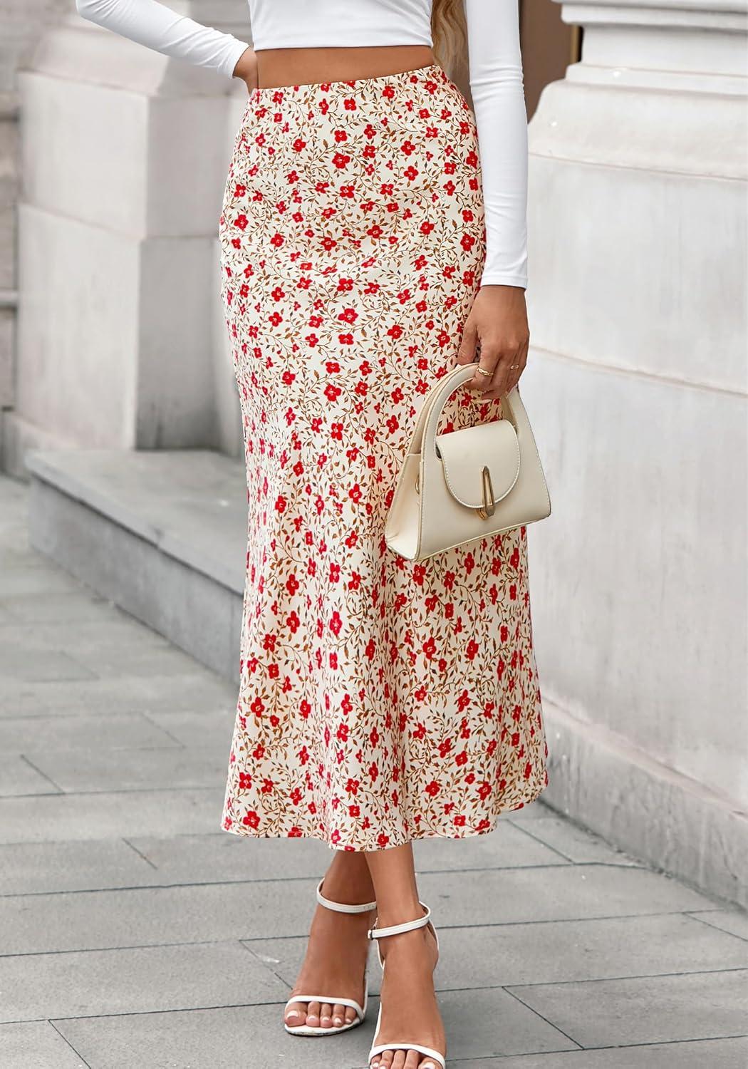 BTFBM Satin Skirts for Women 2025 Fall High Waisted A-Line Leopard Print Cocktail Wedding Long Silk Summer Midi Skirt(Floral Apricot Red)