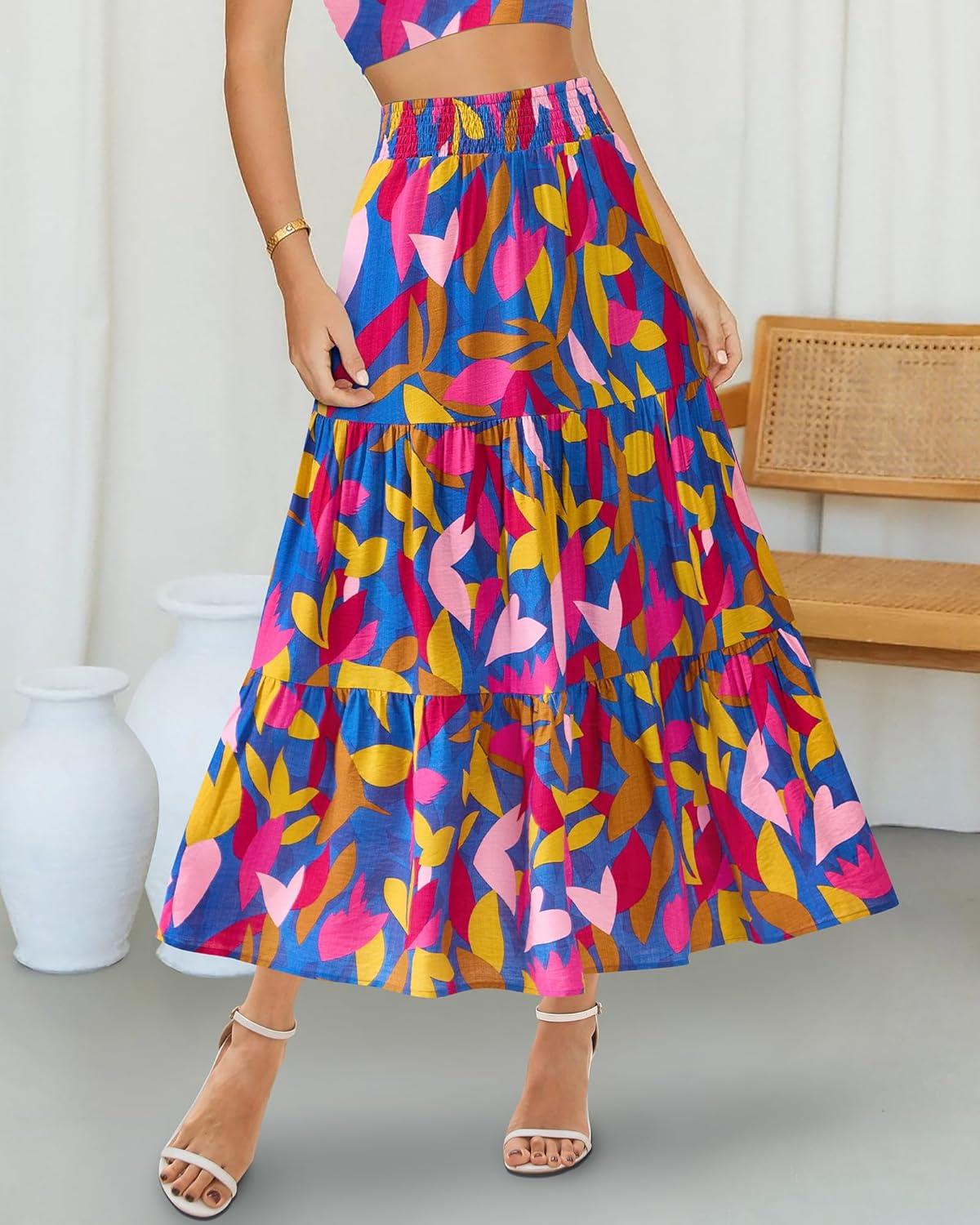 BTFBM Skirts for Women Floral Print Fall Fashion 2025 A Line Elastic High Waist Boho Holiday Maxi Skirt Pockets(Floral Blue Pink)