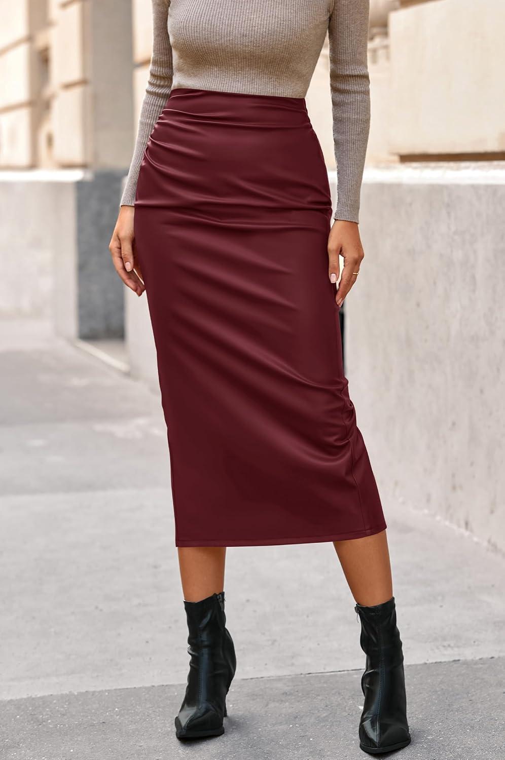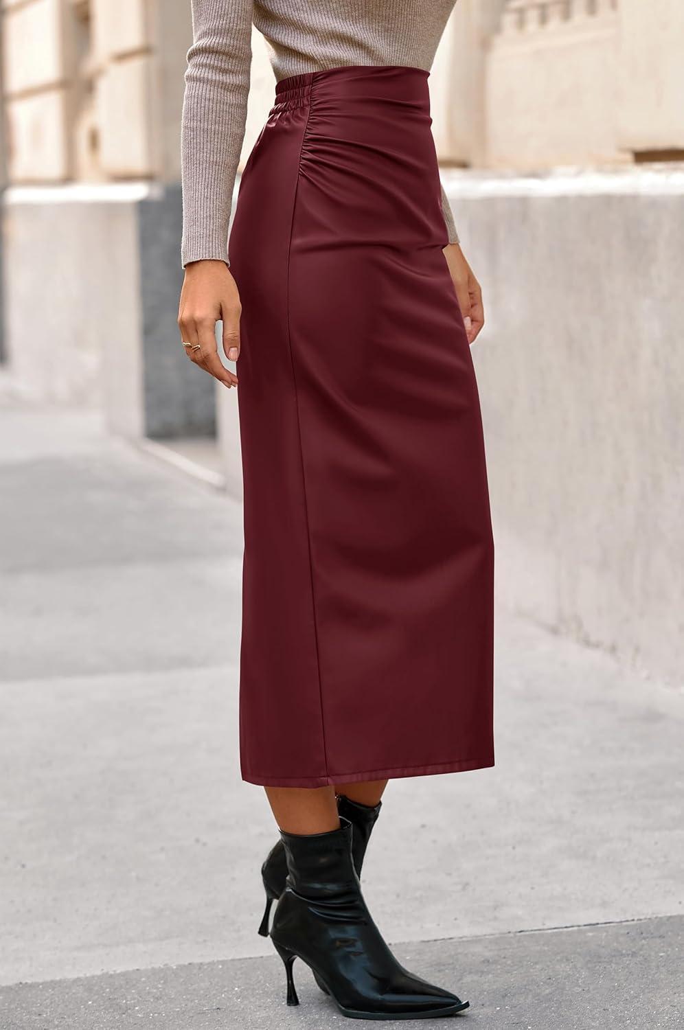 BTFBM Skirts for Women Trendy Fall 2025 Elastic Waist Ruched Bodycon Slit Pencil Midi Leather Skirt Bussiness Casual(Burgundy)
