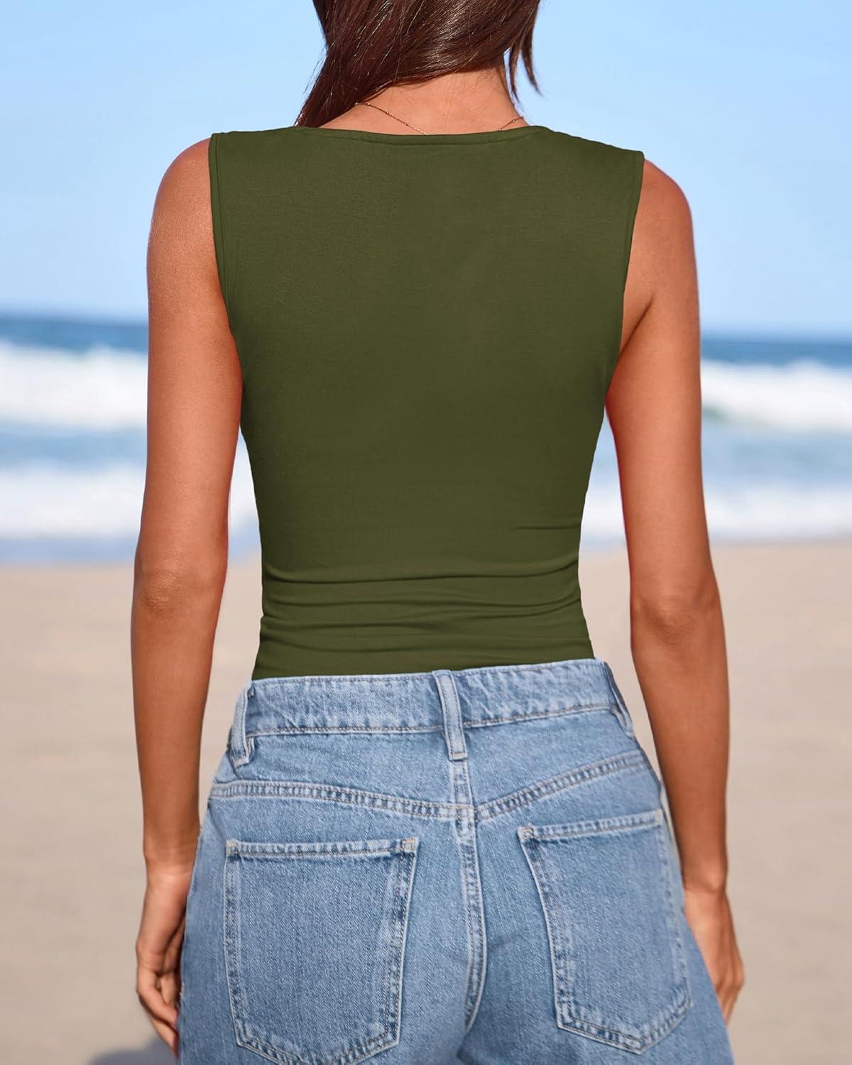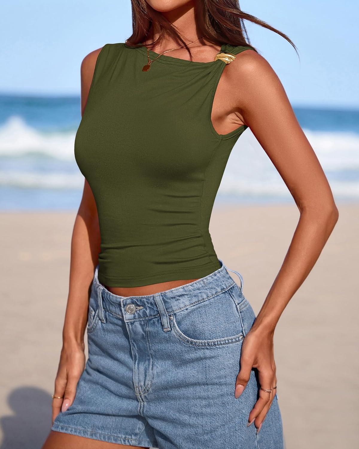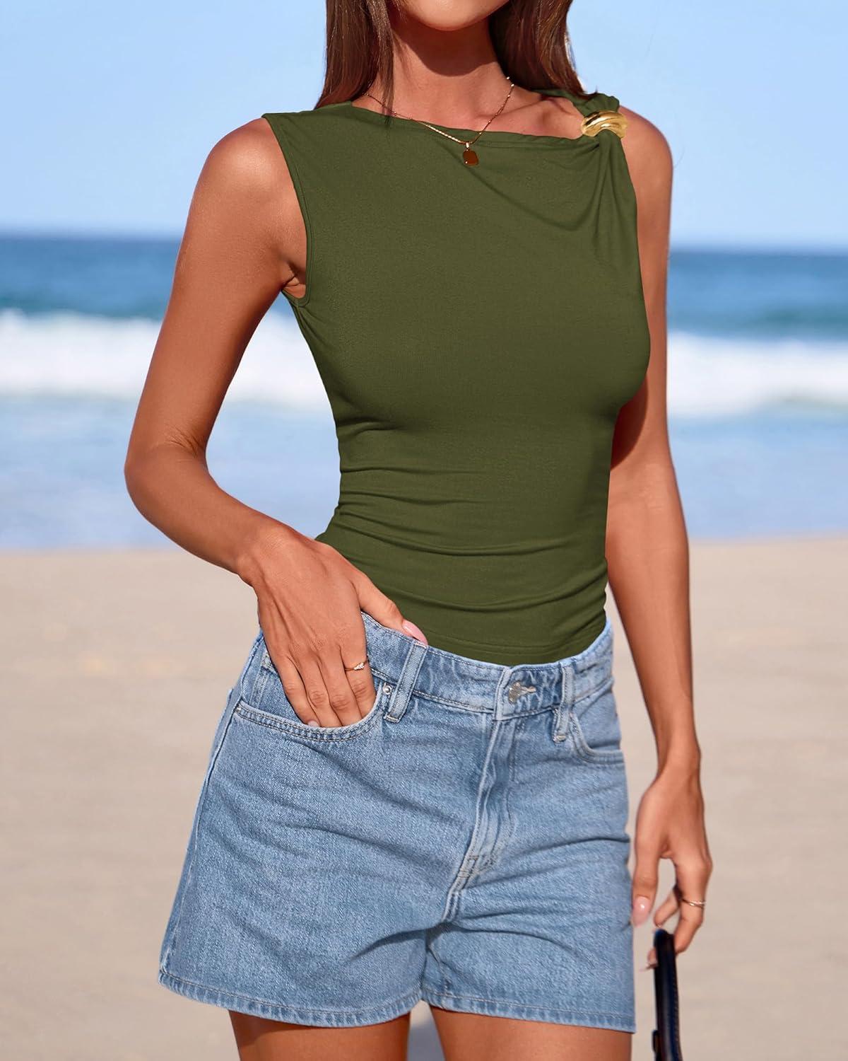 BTFBM Spring Tops for Women 2026 Asymmetrical Neck Sleeveless Going Out Summer Outfits Casual Ruched Y2k Tank Top Clothes(Army Green)