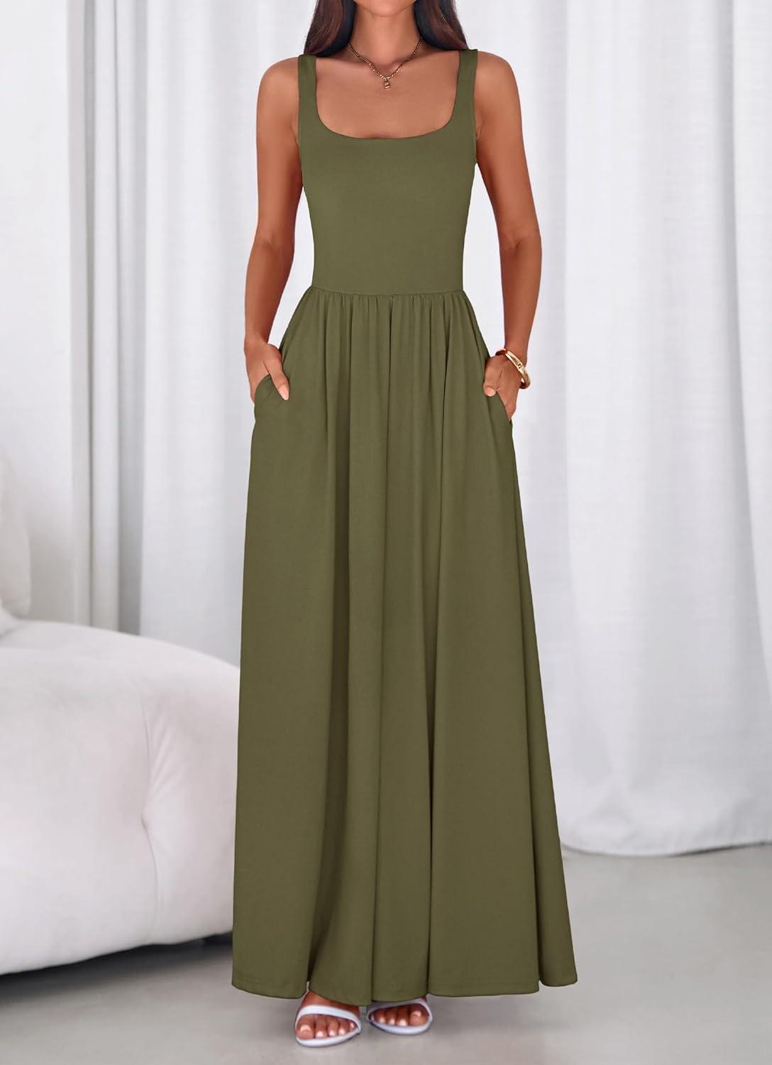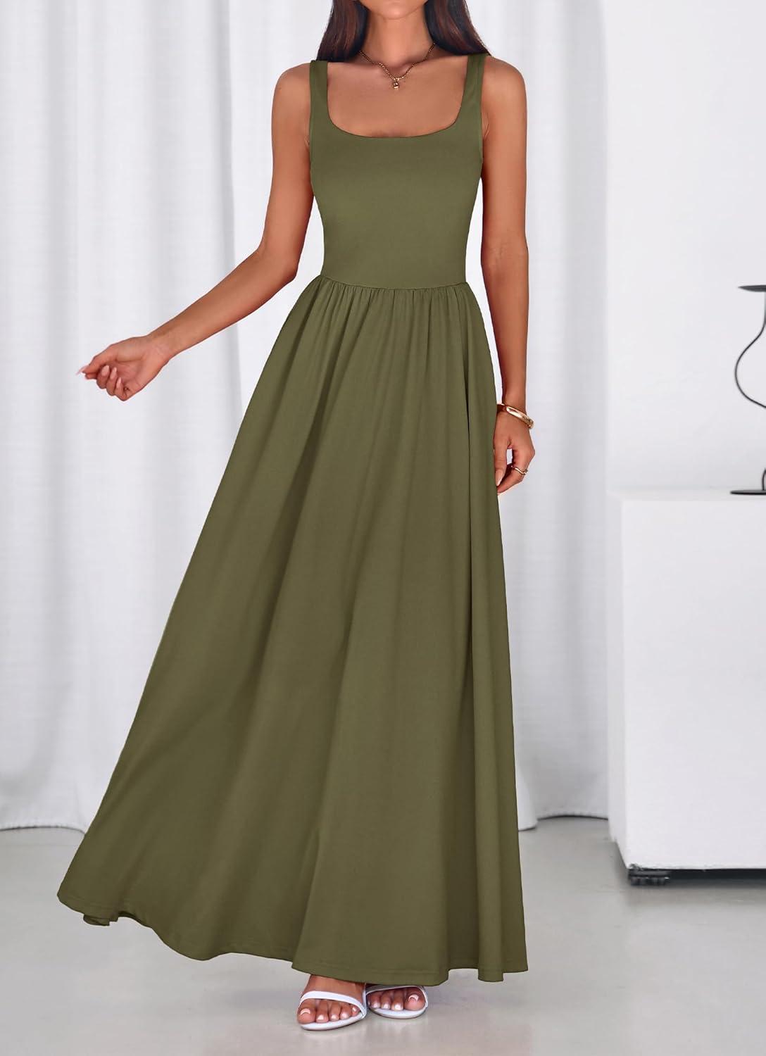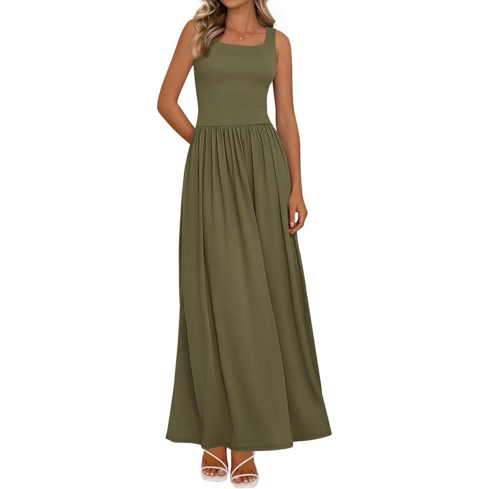 BTFBM Summer Dresses for Women 2026 Maxi Casual Square Neck Flowy Long Sundress Spring Wedding Guest Cocktail Dress(Army Green)