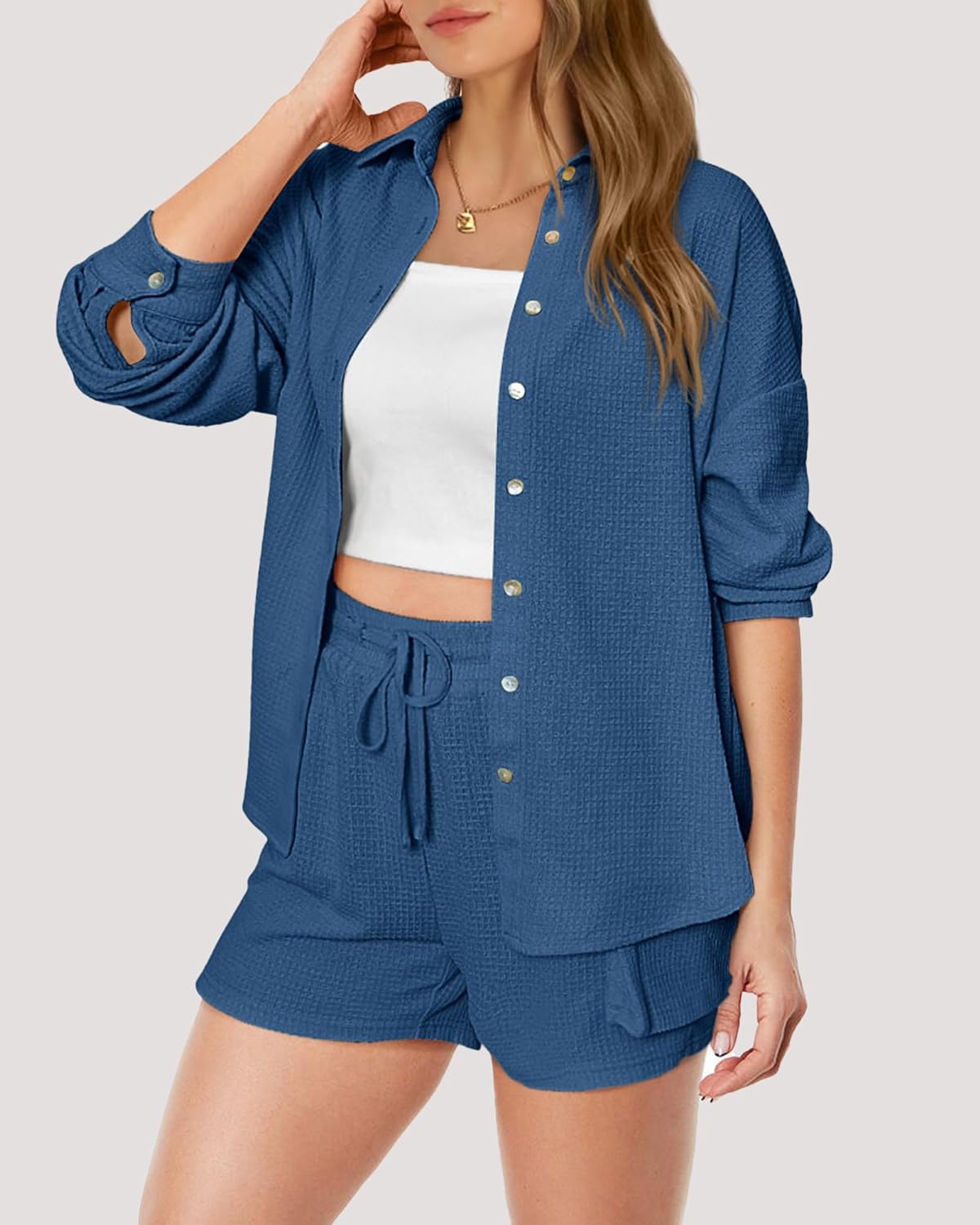BTFBM Women 2 Piece Lounge Sets Button Down Shirt And Elastic Waist Shorts Casual Waffle Knit Fall Outfits with Pocket(Solid Navy Blue)