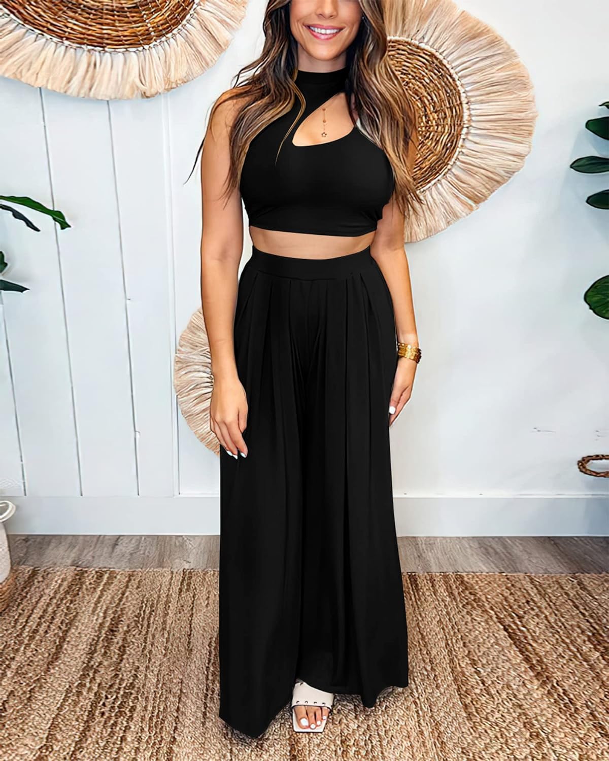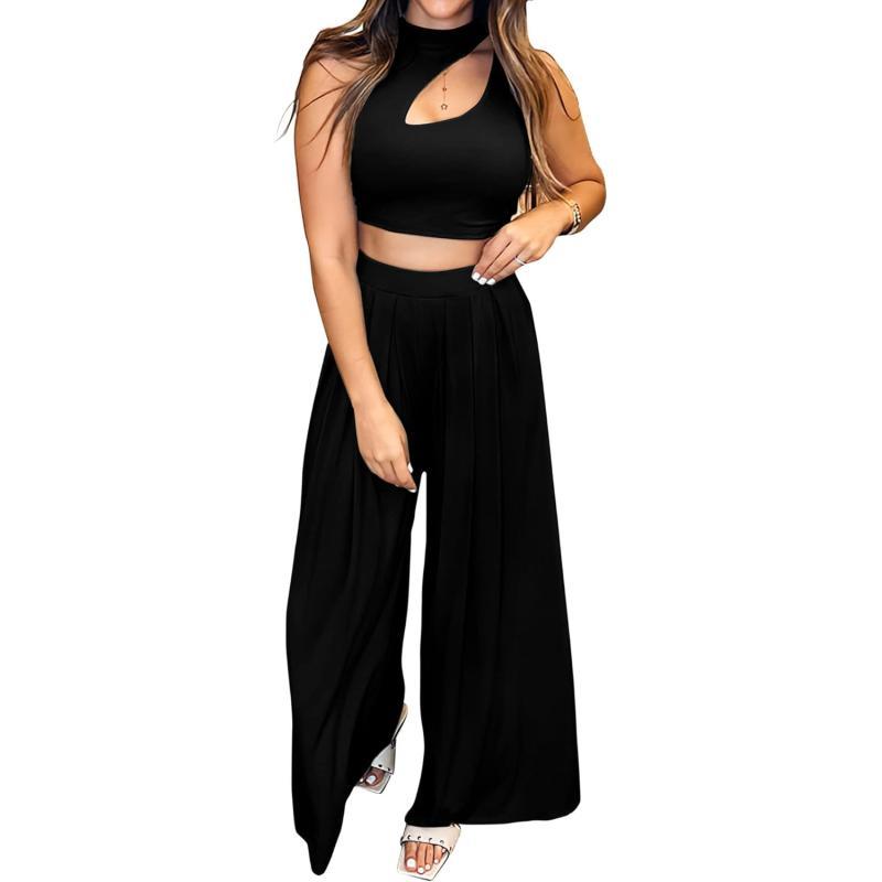BTFBM Women 2 Piece Outfits Spring Summer Tracksuits Mock Neck Sleeveless Cutout Crop Top Wide Leg Long Pants Sweatsuits(Solid Black)