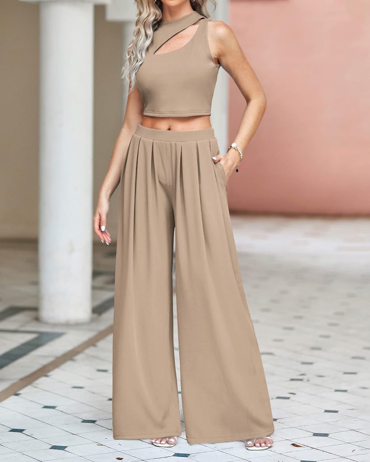 BTFBM Women 2 Piece Outfits Spring Summer Tracksuits Mock Neck Sleeveless Cutout Crop Top Wide Leg Long Pants Sweatsuits(Solid Khaki)