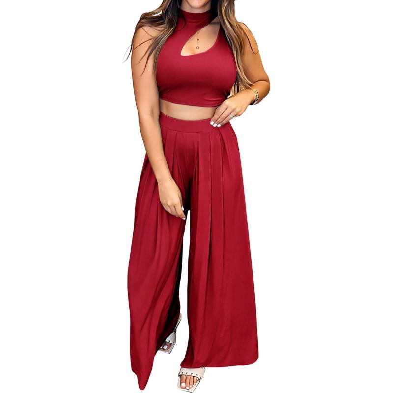 BTFBM Women 2 Piece Outfits Spring Summer Tracksuits Mock Neck Sleeveless Cutout Crop Top Wide Leg Long Pants Sweatsuits(Solid Red)