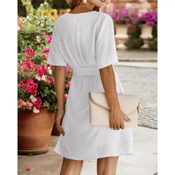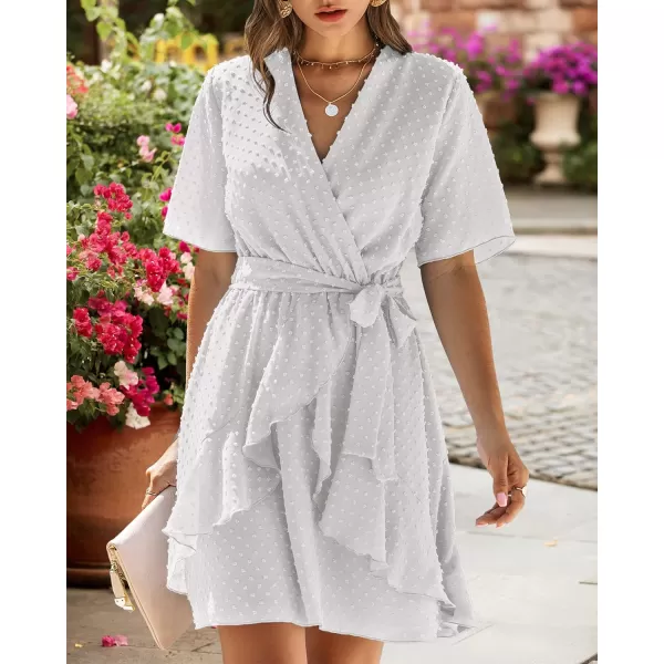 BTFBM Women 2023 Fashion Faux Wrap V-Neck Dresses Short Sleeve High Waist Belt Swing Ruffle Hem Aline Summer Short Dress(White)