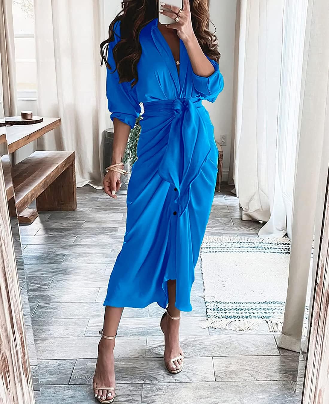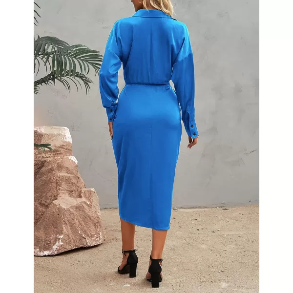 BTFBM Women 2023 Long Sleeve Lapel V Neck Button Down Satin Dress Belted Elegant Ruched Summer Fall Maxi Shirt Dresses(Solid Brilliant Blue)
