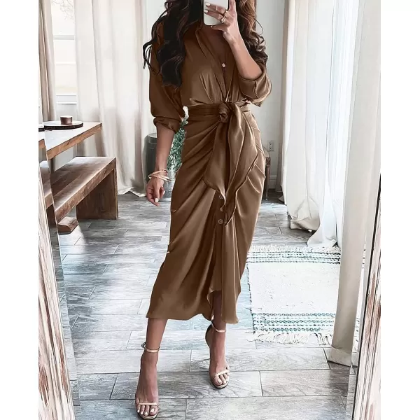 BTFBM Women 2023 Long Sleeve Lapel V Neck Button Down Satin Dress Belted Elegant Ruched Summer Fall Maxi Shirt Dresses(Solid Dark Brown)
