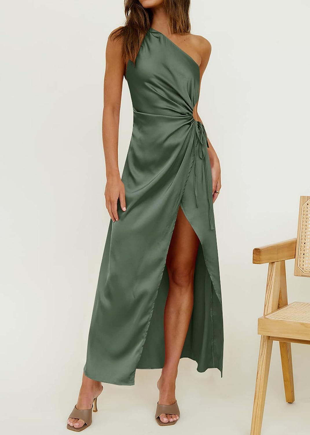 BTFBM Women 2023 One Shoulder Prom Dresses Sleeveless Cutout Ruched Adjustable Split Satin Party Cocktail Maxi Dress(Solid Army Green)