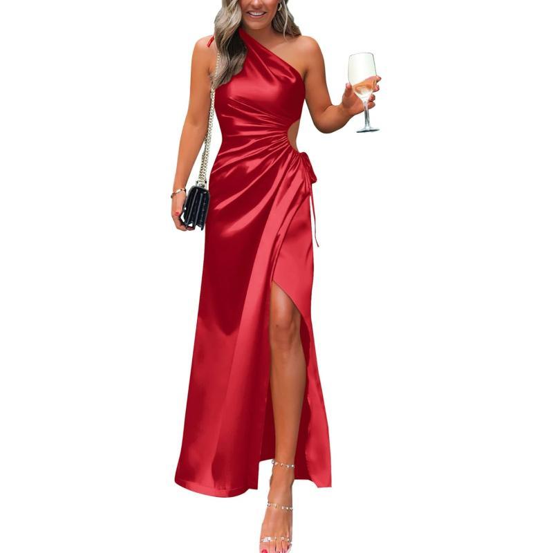 FEATURES: Summer Dresses For Women/Wedding Guest Dress For Women/One Shoulder Dress For Women/Cocktail Maxi Dress/Sleeveless Night Out Dress/Women Bodycon Dress/Cutout Waist With Adjustable Drawstring/Ruched Detail At Side Waist/Wrap Split Hem/Classic Solid Color/Soft And Lightweight Satin Fabric/Ankle Length