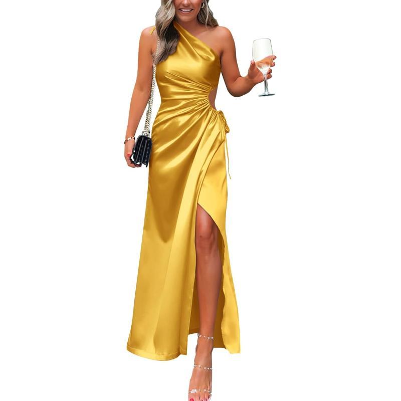 FEATURES: Summer Dresses For Women/Wedding Guest Dress For Women/One Shoulder Dress For Women/Cocktail Maxi Dress/Sleeveless Night Out Dress/Women Bodycon Dress/Cutout Waist With Adjustable Drawstring/Ruched Detail At Side Waist/Wrap Split Hem/Classic Solid Color/Soft And Lightweight Satin Fabric/Ankle Length