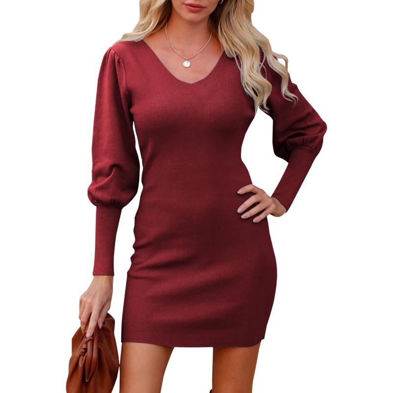 BTFBM Women 2023 Pullover Sweater Dress V Neck Long Sleeve Bodycon Embroidered Back Party Rib Knit Mini Fall Dresses(Solid Wine Red)