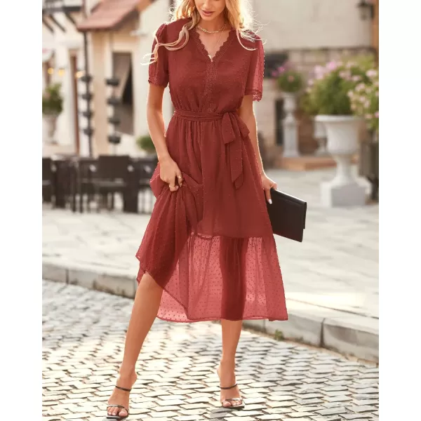 BTFBM Women 2023 Summer Boho Midi Dress Short Sleeve V Neck Swiss Dot Belted High Waist Ruffle Tiered A-Line Beach Dress(Swiss Dot Brown)