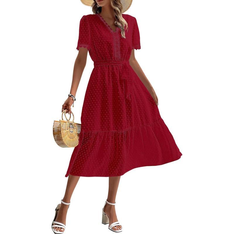 BTFBM Women 2023 Summer Boho Midi Dress Short Sleeve V Neck Swiss Dot Belted High Waist Ruffle Tiered A-Line Beach Dress(Swiss Dot Red)
