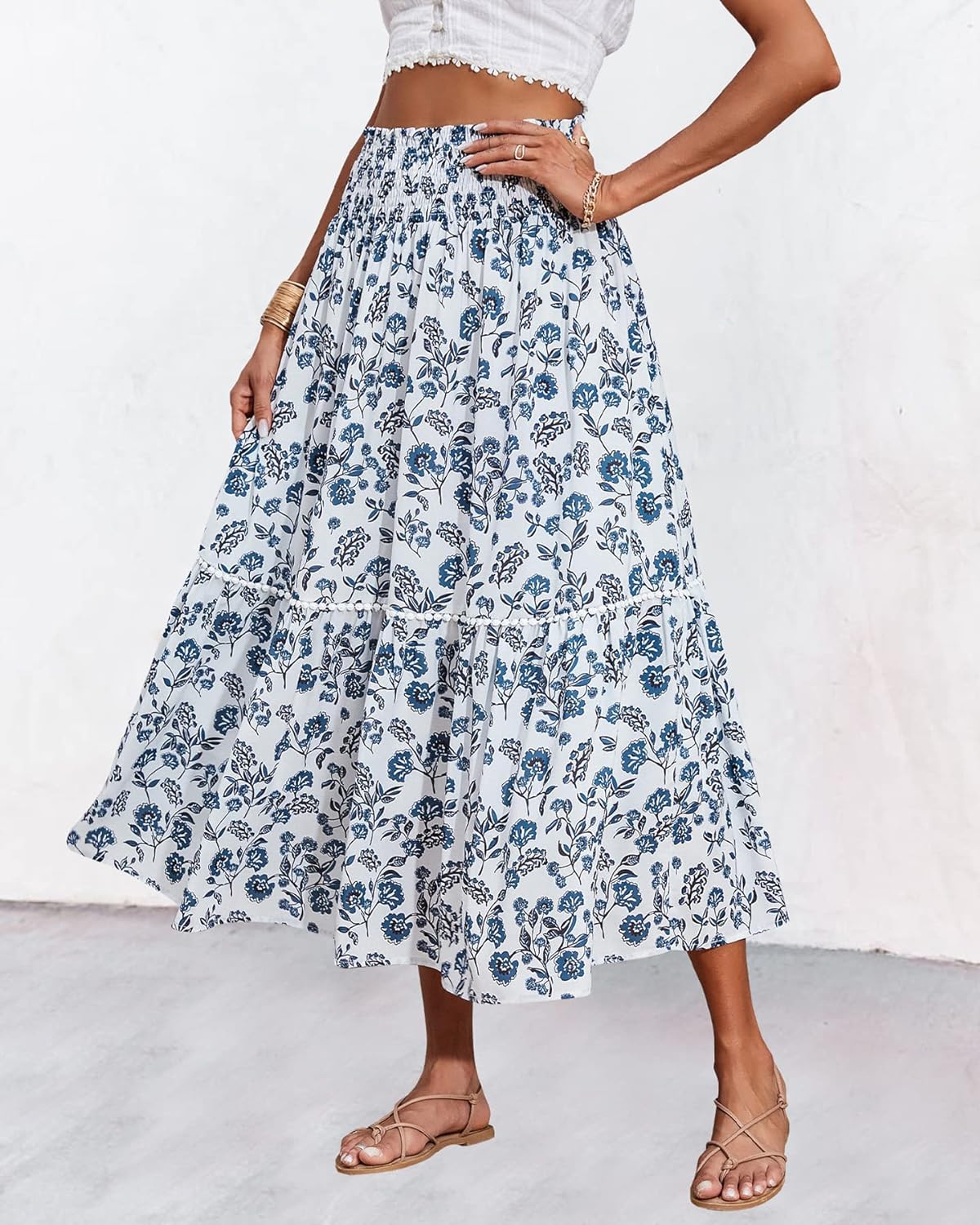 FEATURES: Size: S=US 4-6,M=US 8-10,L=US 12-14,XL=US 16-18 / Summer Skirts For Women / Women's Boho Skirt / Long Skirts For Women / Floral Print All-Over / Elastic High Waist / A-Line Shape / Soft And Lightweight Fabric / Loose Fit / Subtle Small Dot Trimming Throughout / Midi Length / Flowy Ruffled Hemline / Fit For Variety Of Body
