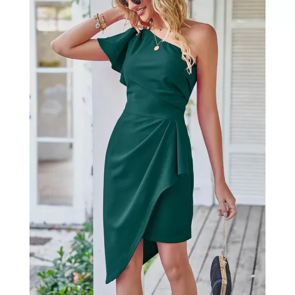 BTFBM Women 2023 Summer Fashion Elegant One Shoulder Cocktail Dress Ruffle Sleeve Wrap Ruched Bodycon Short Party Dresses(Solid Dark Green)