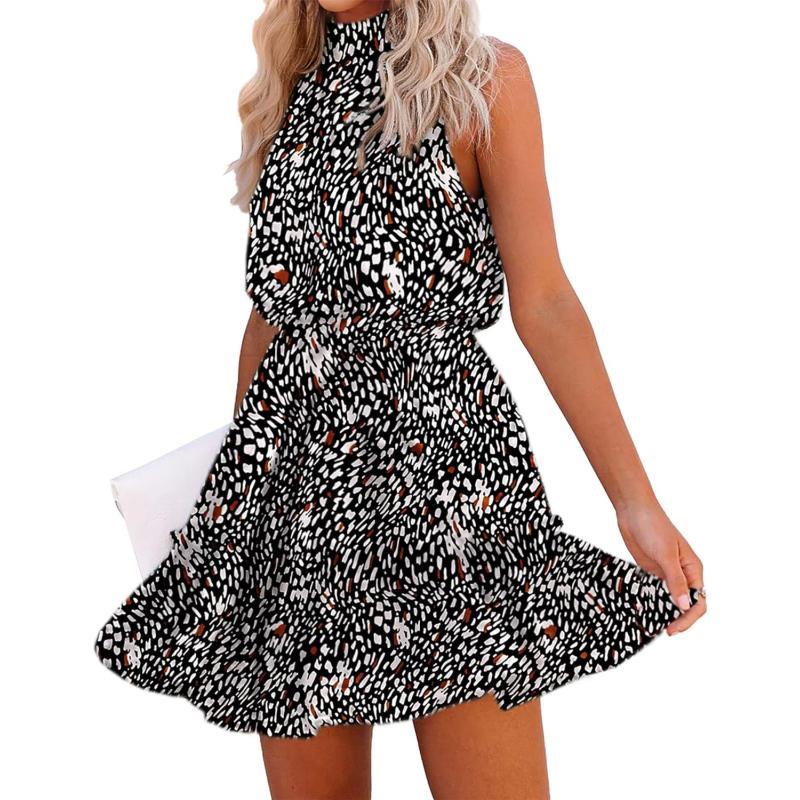 BTFBM Women 2023 Summer Halter Neck Dresses Sleeveless Casual Floral Polka Dot Leopard Print Short Boho Ruffle Sundress(Leopard Black)