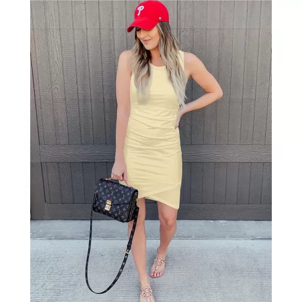 BTFBM Women 2023 Summer Sleeveless Tank Dresses Crew Neck Slim Fit Short Casual Ruched Bodycon Party Club Mini Dress(Light Yellow)