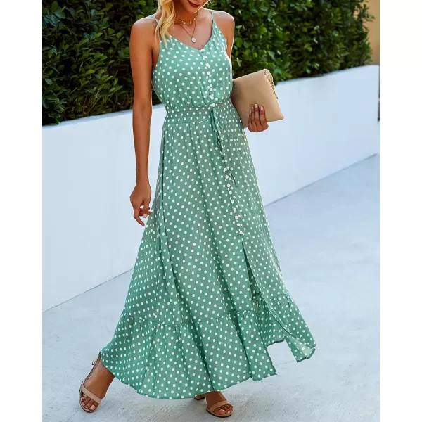 BTFBM Women 2023 Summer Spaghetti Strap V Neck Dress Polka Dot Floral Button Down Slit Sleeveless A-Line Maxi Dresses(Polka Dot Light Green)