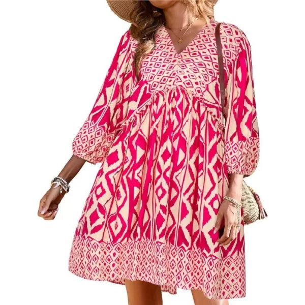 BTFBM Women Casual Spring Summer Dresses V Neck 3/4 Long Sleeve Ruffle Floral Flowy Boho Babydoll Mini Short Beach Dress(Print Rose Red)