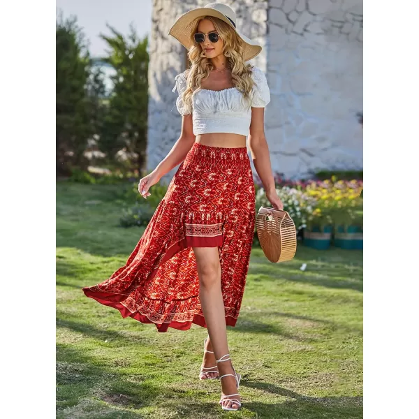 BTFBM Women 2023 Summer Spring Boho Long Skirts Dress Floral Print Elastic Waist Split Ruffle High Low Beach Maxi Skirt(X – Floral Red)