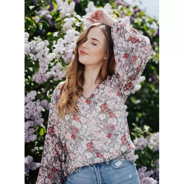 BTFBM Women Casual Boho Floral Blouse Shirts V Neck Long Puff Sleeve Lightweight Chiffon Spring Summer Fashion 2023 Tops(Floral Red)